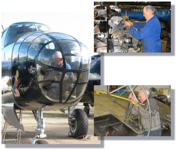 Ed Doucette (upper right) worked on one of the Mitchell's two 14-cylinder Wright Cyclone R-2600 radial engines that weigh nearly 2,000 pounds each. Chuck MacLaren (lower right) worked on