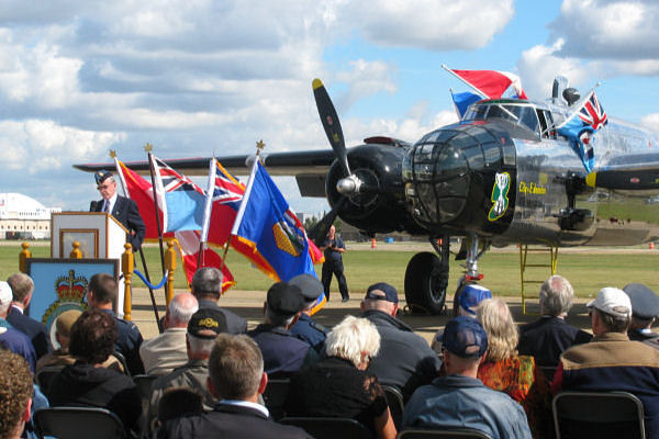 Jim Gillespie, president of the 418 Squadron Association, addresses the crowd present for the roll-out on September 3, 2011, where the Mitchell was officially dedicated to the Alberta