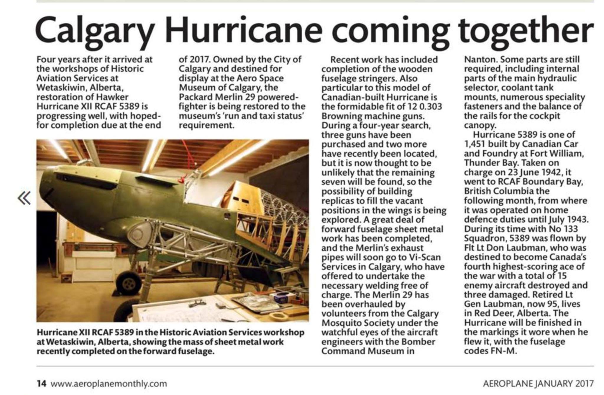 Featured in the January 2017 issue of AEROPLANE MONTHLY magazine out of the UK, is a half page story on the restoration progress of the Hurricane.