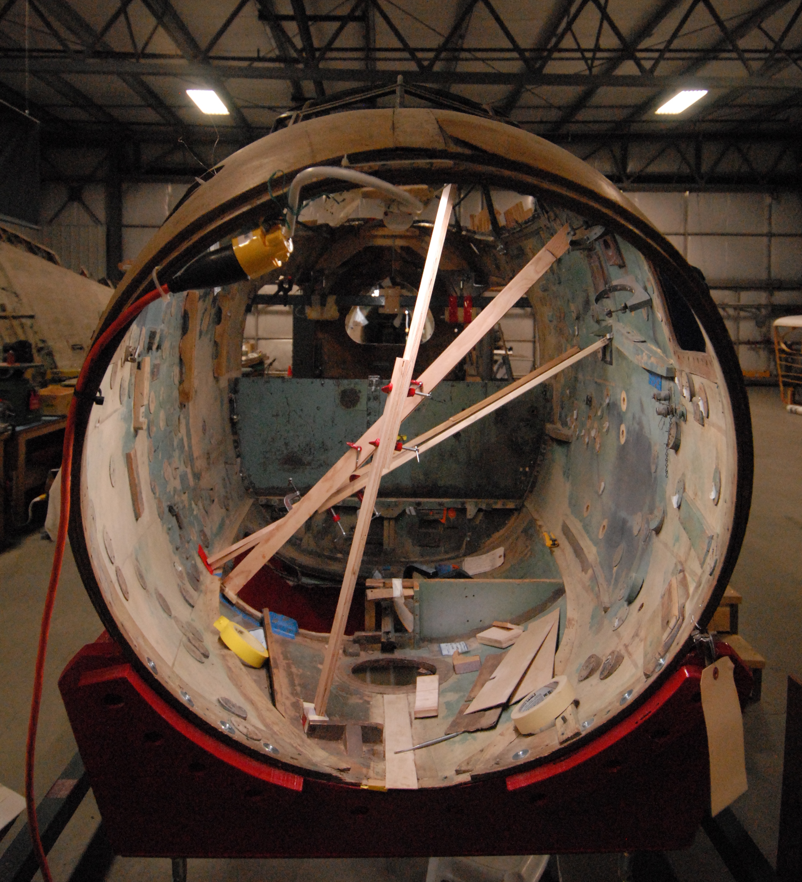 Seen here are the temporary telescoping supports used to hold newly reinstalled wood pieces inside the nose and cockpit area as the glue dries and cures.