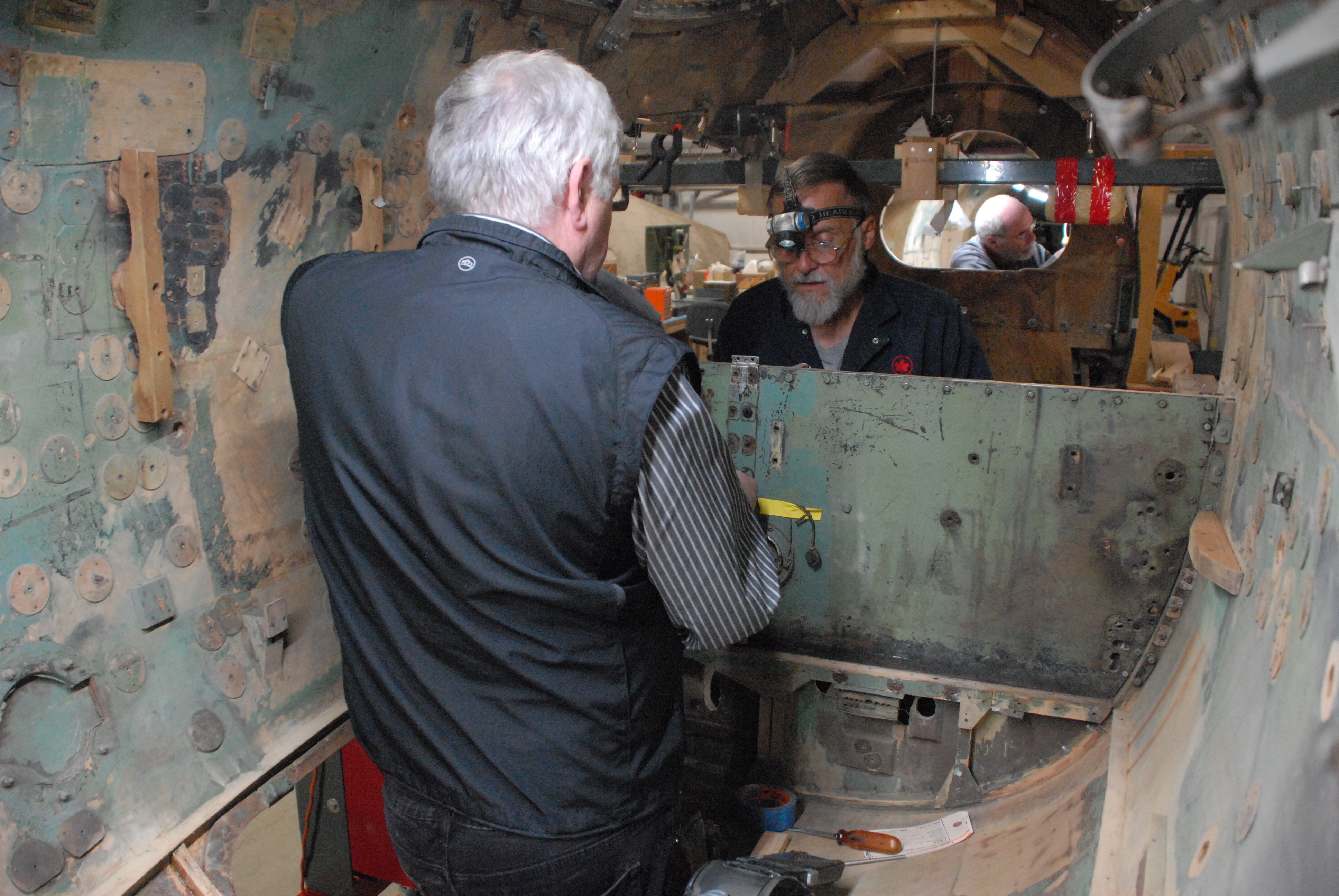 Ken P. and David D. work to remove the armour plating from the front side of bulkhead 2. It has since been stripped and repainted and is ready for reinstallation. The Mosquito crew sat on top of this bulkhead and the armour plating protected their legs from enemy fire from behind them.