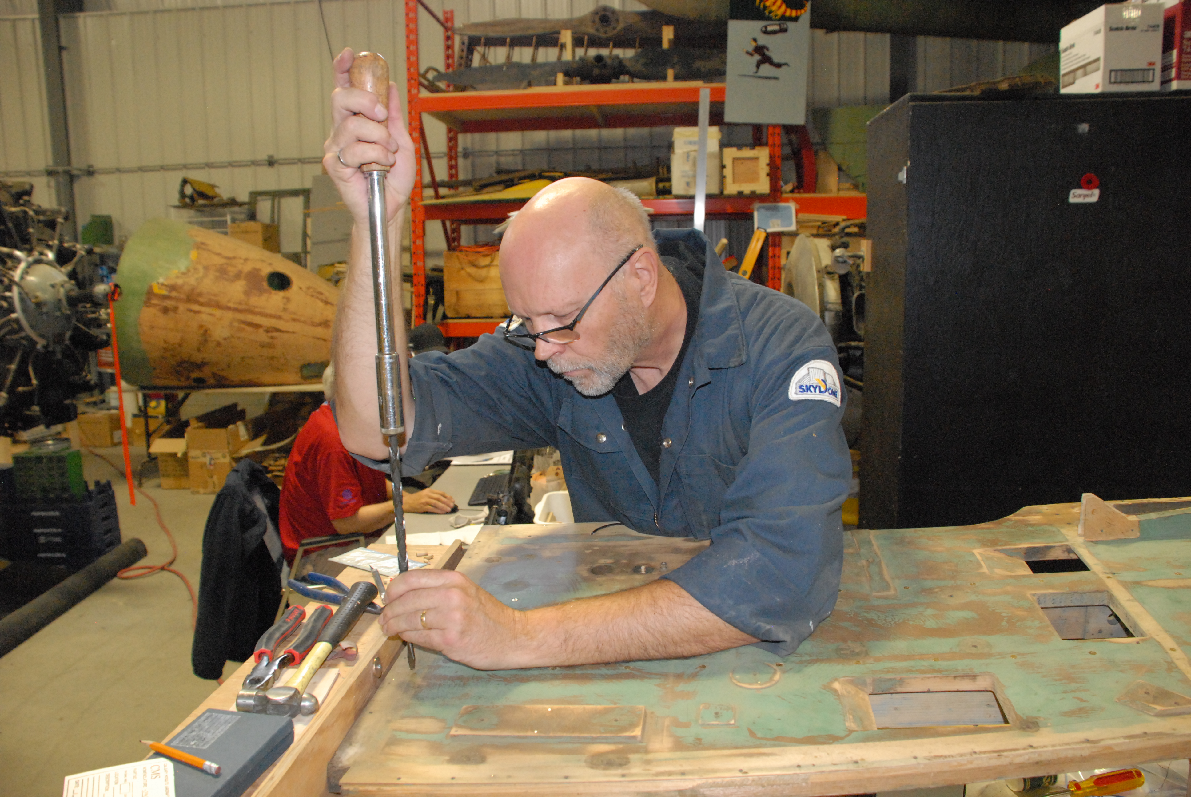 Andy W's most recent project has been the restoration of the cockpit floor which was removed from the fuselage last July. Here Andy uses a Yankee screwdriver to reinstall some hardware on the underside of the floor. Though often discouraged today, the Yankee was a favourite tool of de Havilland workers to secure the thousands of brass screws.