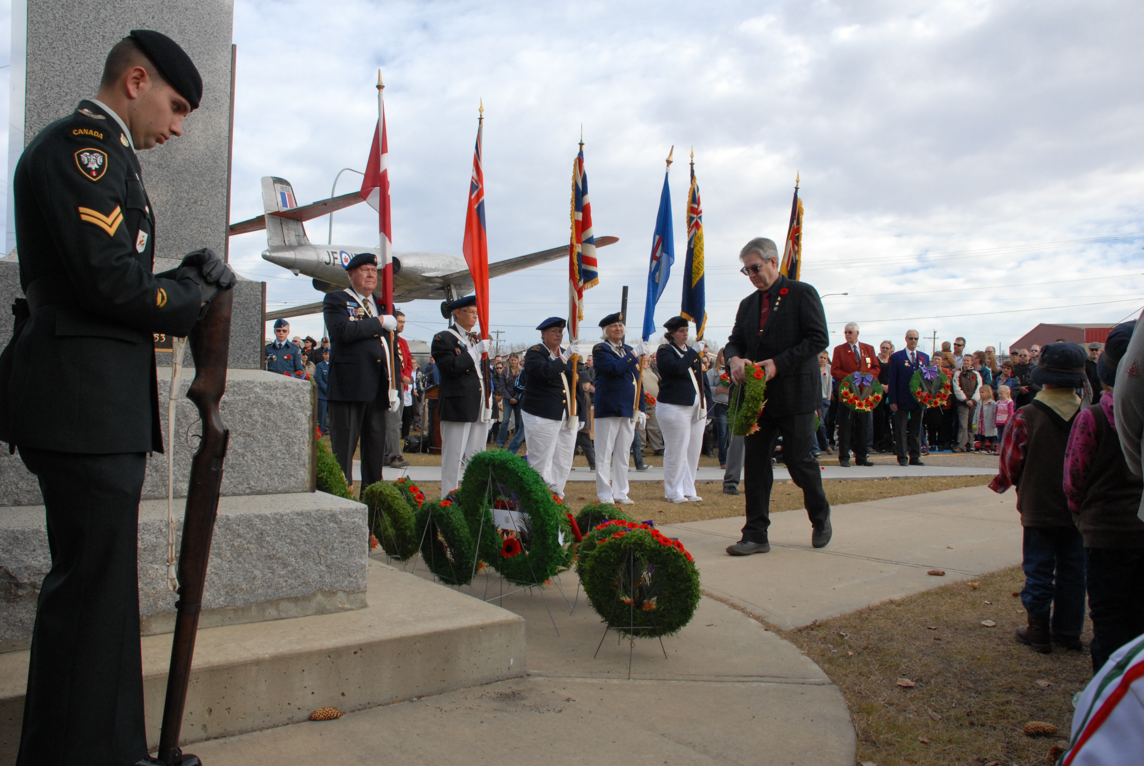 CMS board member Brian Collins lays a wreath at the cenotaph at the Bomber Command Museum.
