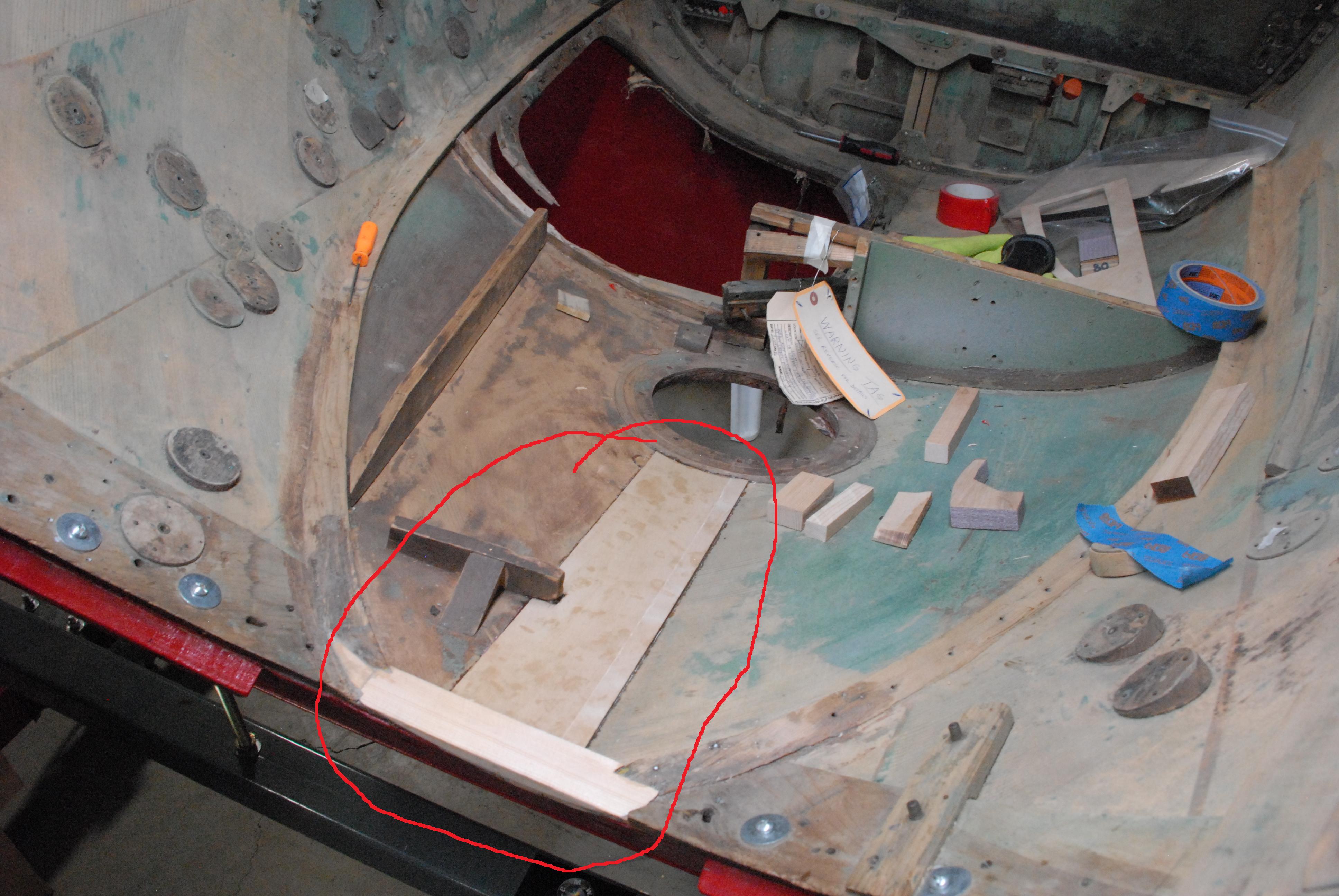 The bulkhead under the floor on the right side with the crew ladder access door has been replaced. The original plywood was broken in multiple pieces, but the rib was intact. You will recall the rib had worn grooves from the crew ladder being installed. The new plywood was bonded to the rib, sanded to match the wear marks of the rib. We are very happy with Gary's installation as we can still see the exact path of the ladder each time it was slid into place.