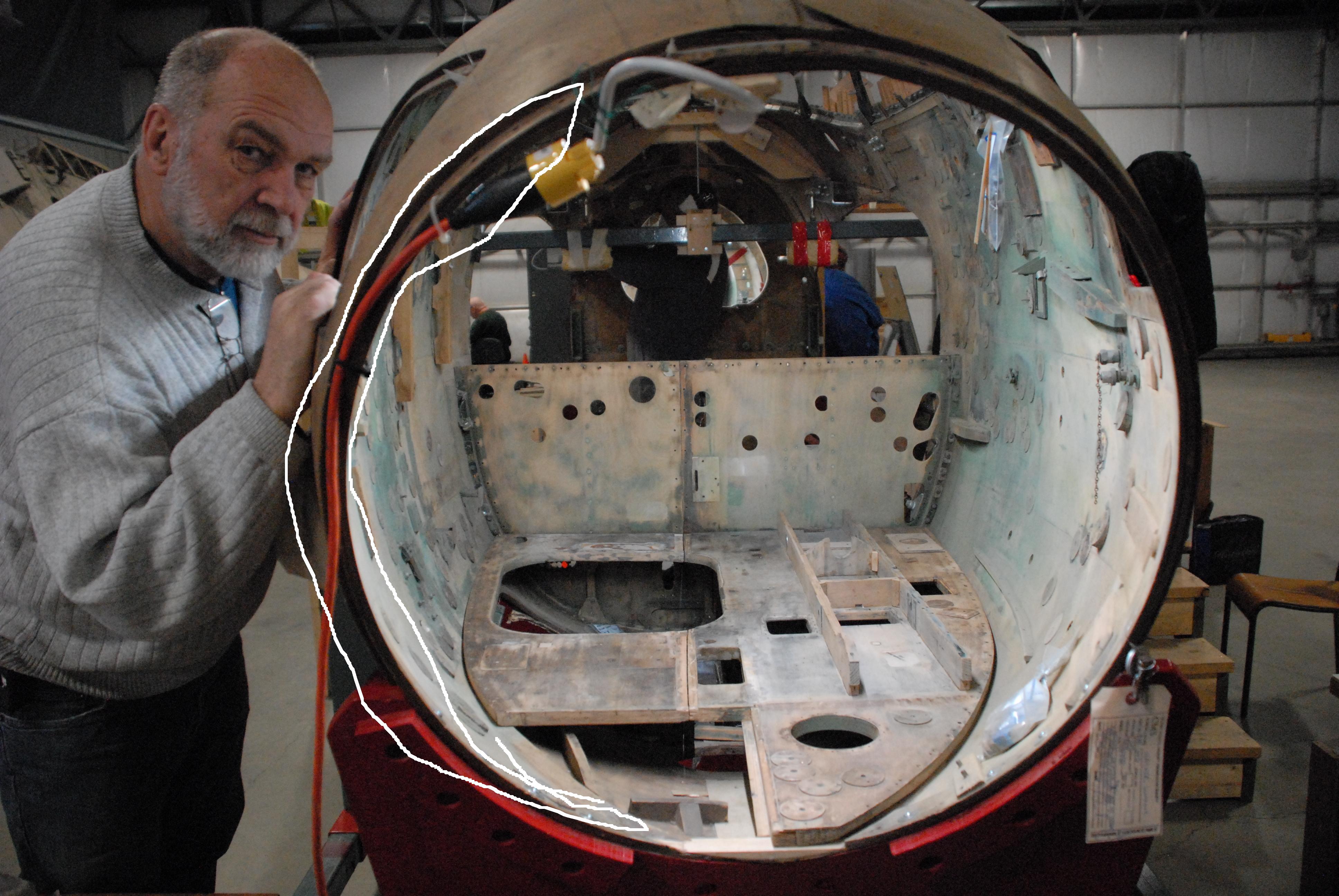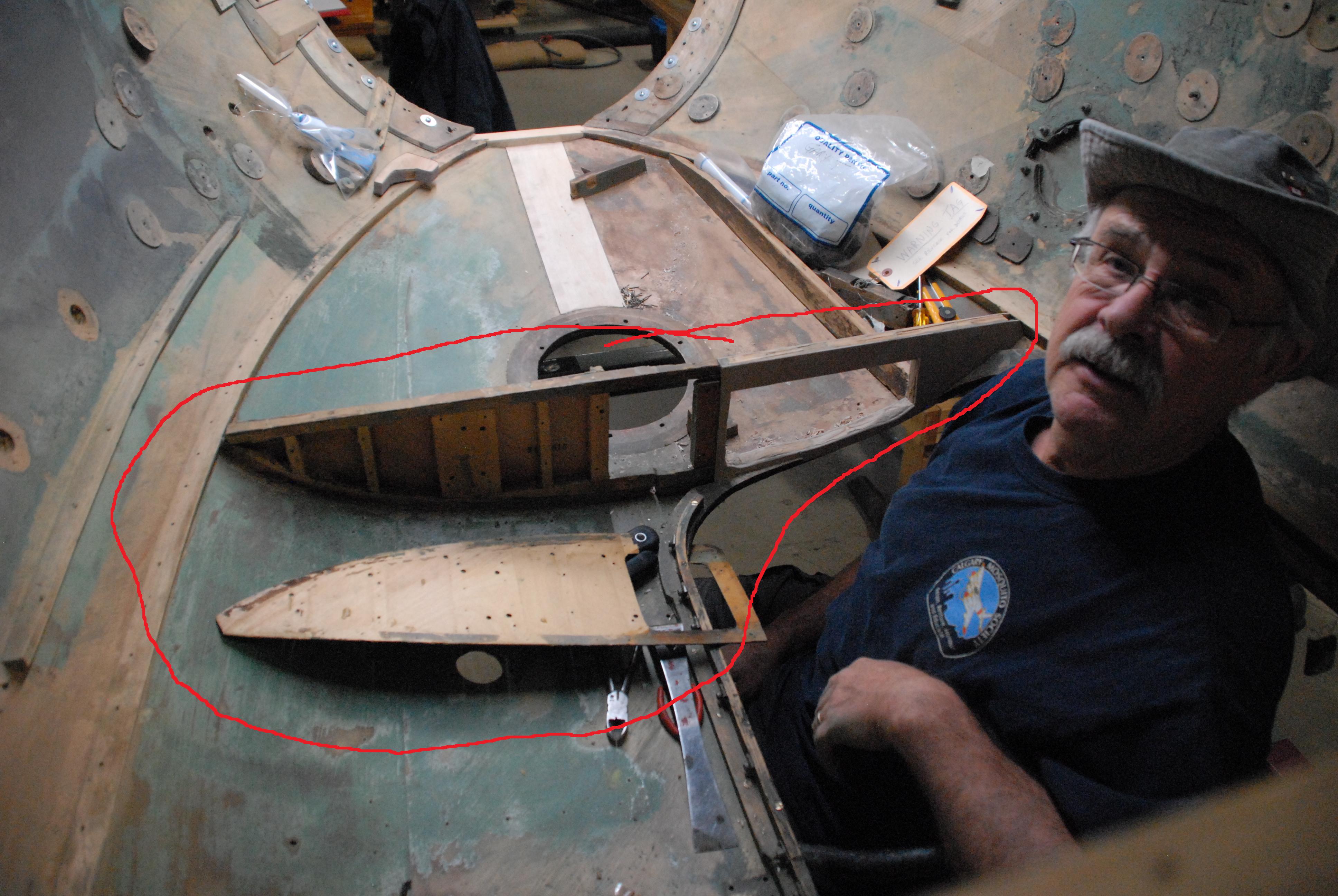 Gary T. working on the bulkhead just forward of the crew access port. The right side was replaced with all new material while the left side is repaired with new ribs and original ply. The hole on the right side of the bulkhead is where the ladder is stored and shows years of wear on its lower edge.