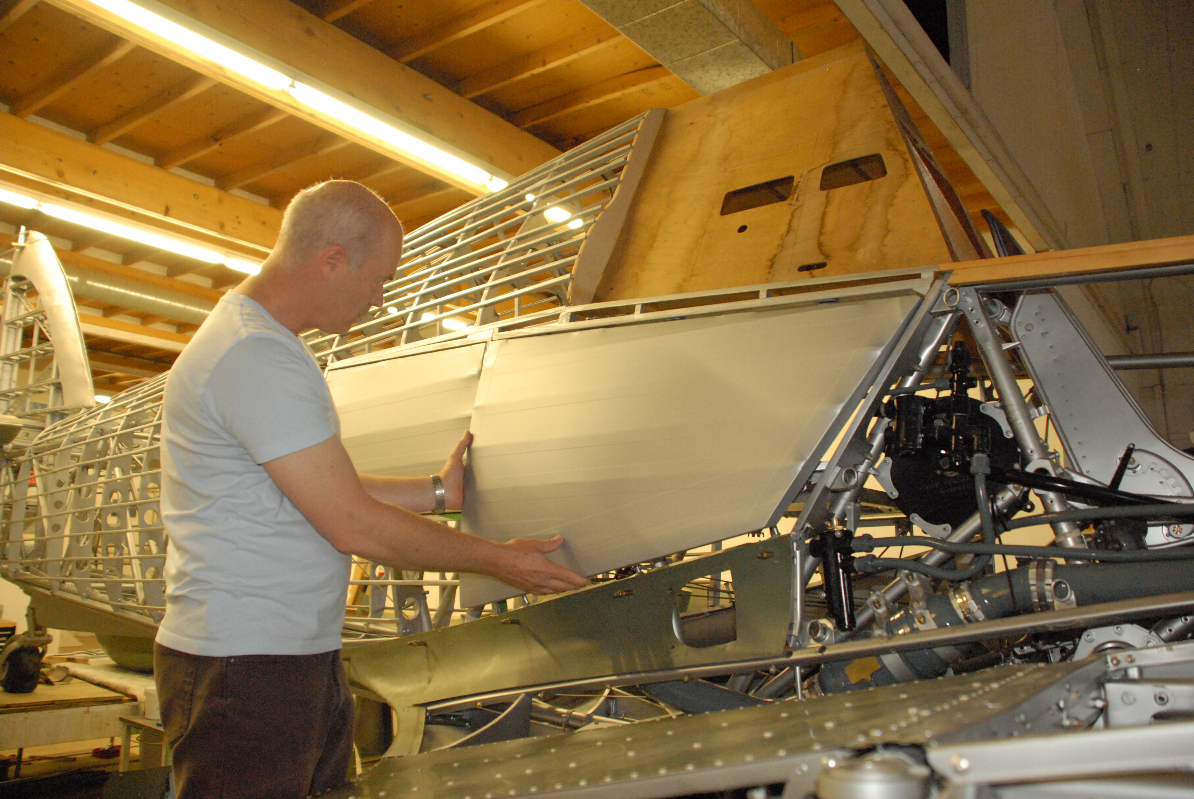 On special event and open house days our volunteers tend to spend more time talking to visitors than working on the Mosquito. Here Andy manages a bit of both as he talks to visitors about the work he is doing on the ferrules and cockpit floor.