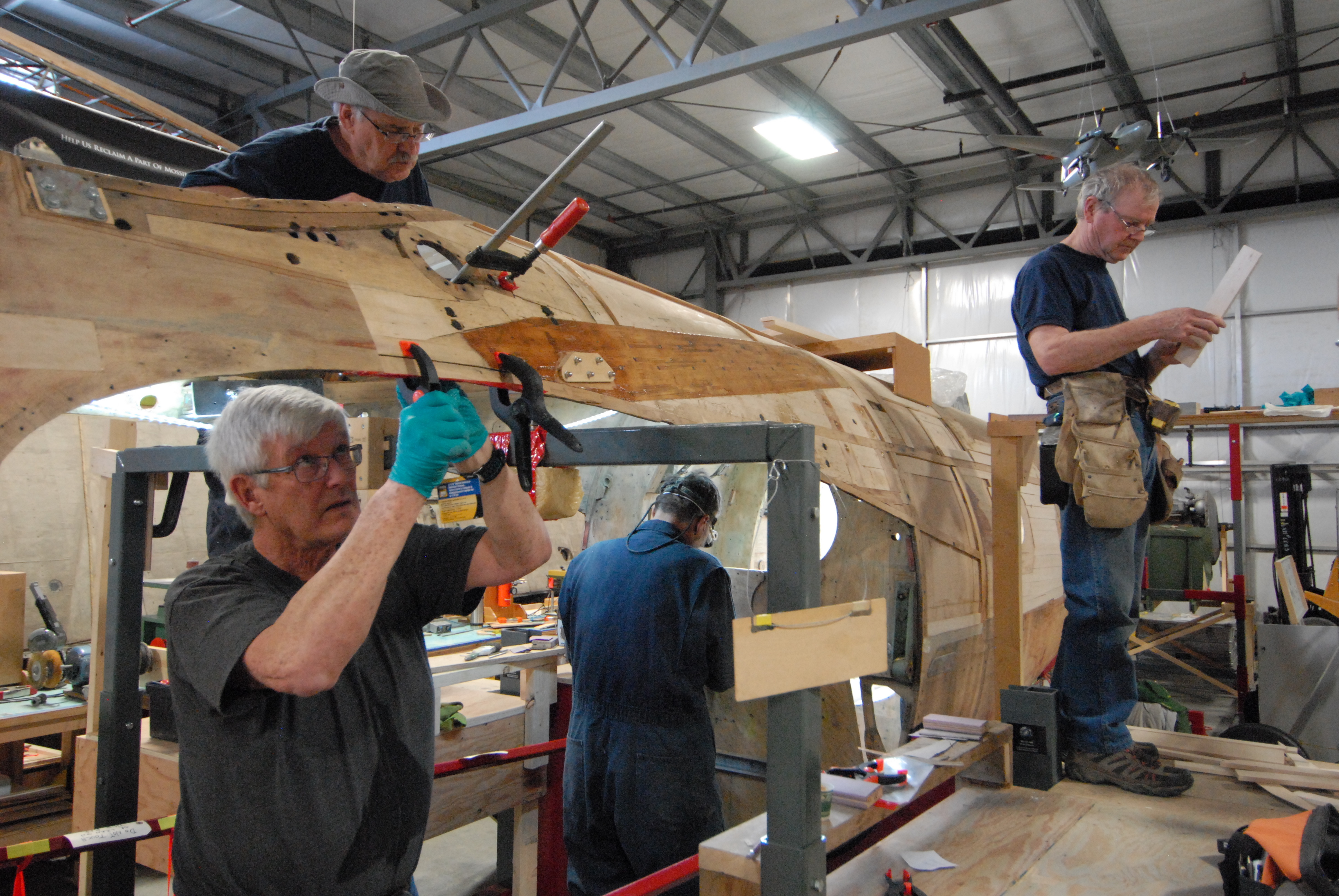 Everyone busy at their stations as described above: Cam on the wing attach bracket area, Gary on the rear canopy edge, Davey on bulkhead #3 and Roger replacing balsa.