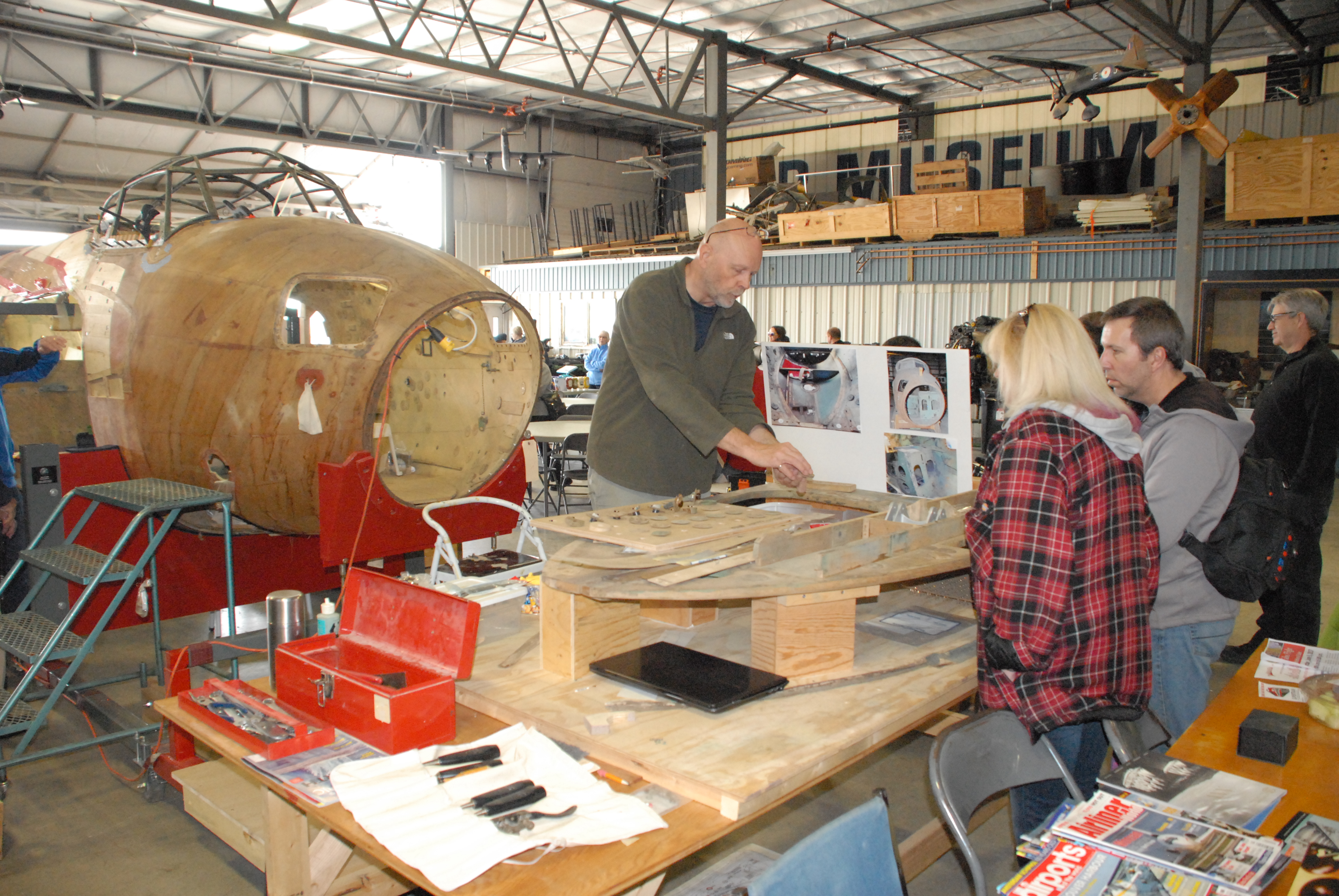 Byron Reynolds holds court, talking to members of the CMS about the restoration progress and challenges on the Hurricane. He now estimates completion for the spring of next year.