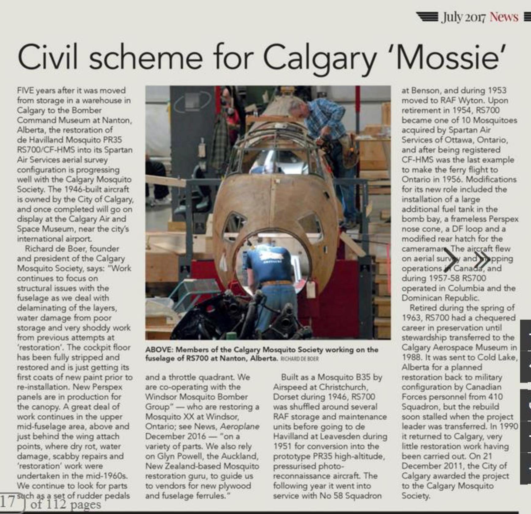 In May we were contacted by AEROPLANE magazine out of England for an update on the Mosquito restoration, which resulted in a half page story in their July edition.