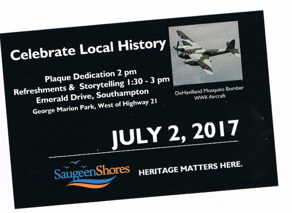 Since November 2014, we have been consulting with a historical organization in Southampton, ON which wanted to erect a memorial plaque in their town to honour the fact that Mosquito fuselages were built there during World War II. In alignment with our 'Honour and Educate' mandate, we have been proud to be able to supply information and edits through extensive correspondence, to their memorial which was unveiled in a public ceremony on July 2.