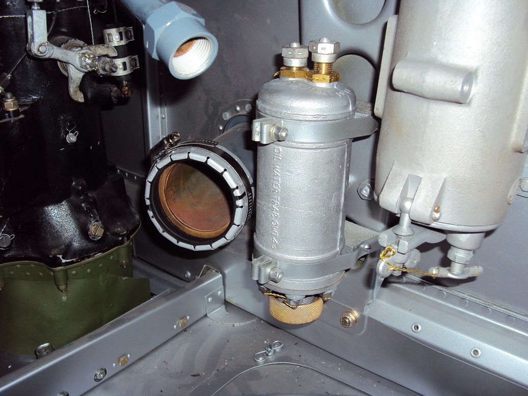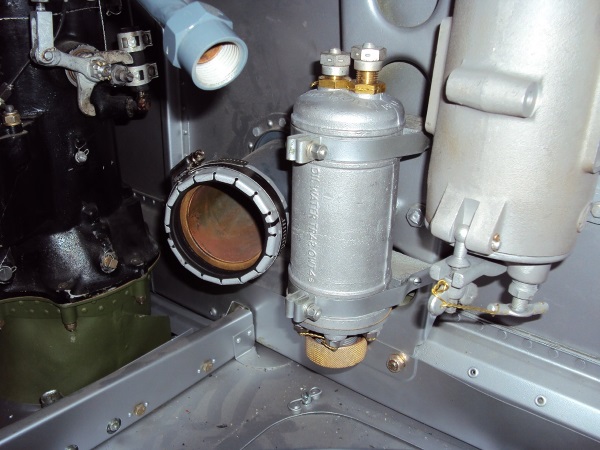 Finished overhaul of air system oil/water separator unit, installed same in position on forward face of center section front spar.
