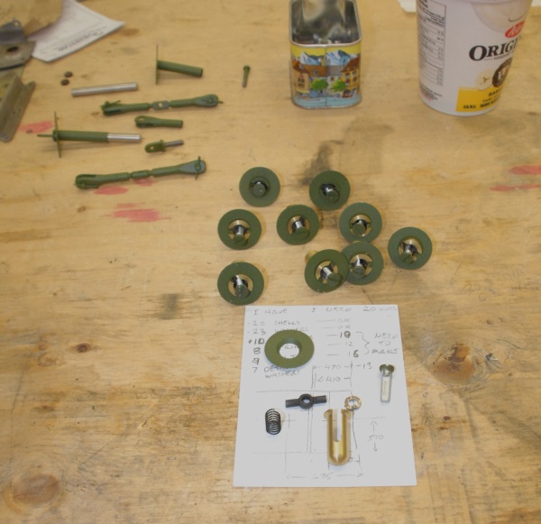 Fasteners for the gun bay doors. Each is comprised of six different parts, five of which must be machined or milled. Producing just 20 of these consumed one month's labour.