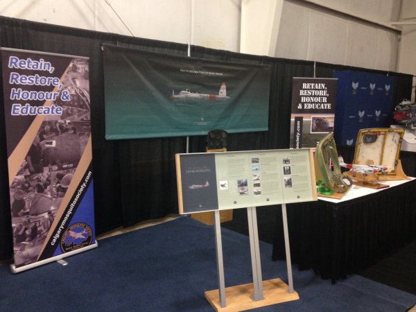 The following weekend, July 29 and 30, we were in full display mode for two days at the Wings Over Springbank Airshow. Organized chiefly by board members Jack McWilliam and Colette Provost, we set up a tent, tables and displays to spread the gospel to the many visitors over the weekend. We had a prime location on the walking route from the parking lot to the flight line and were kept very busy for two days talking Mosquito and Hurricane history and restoration progress.