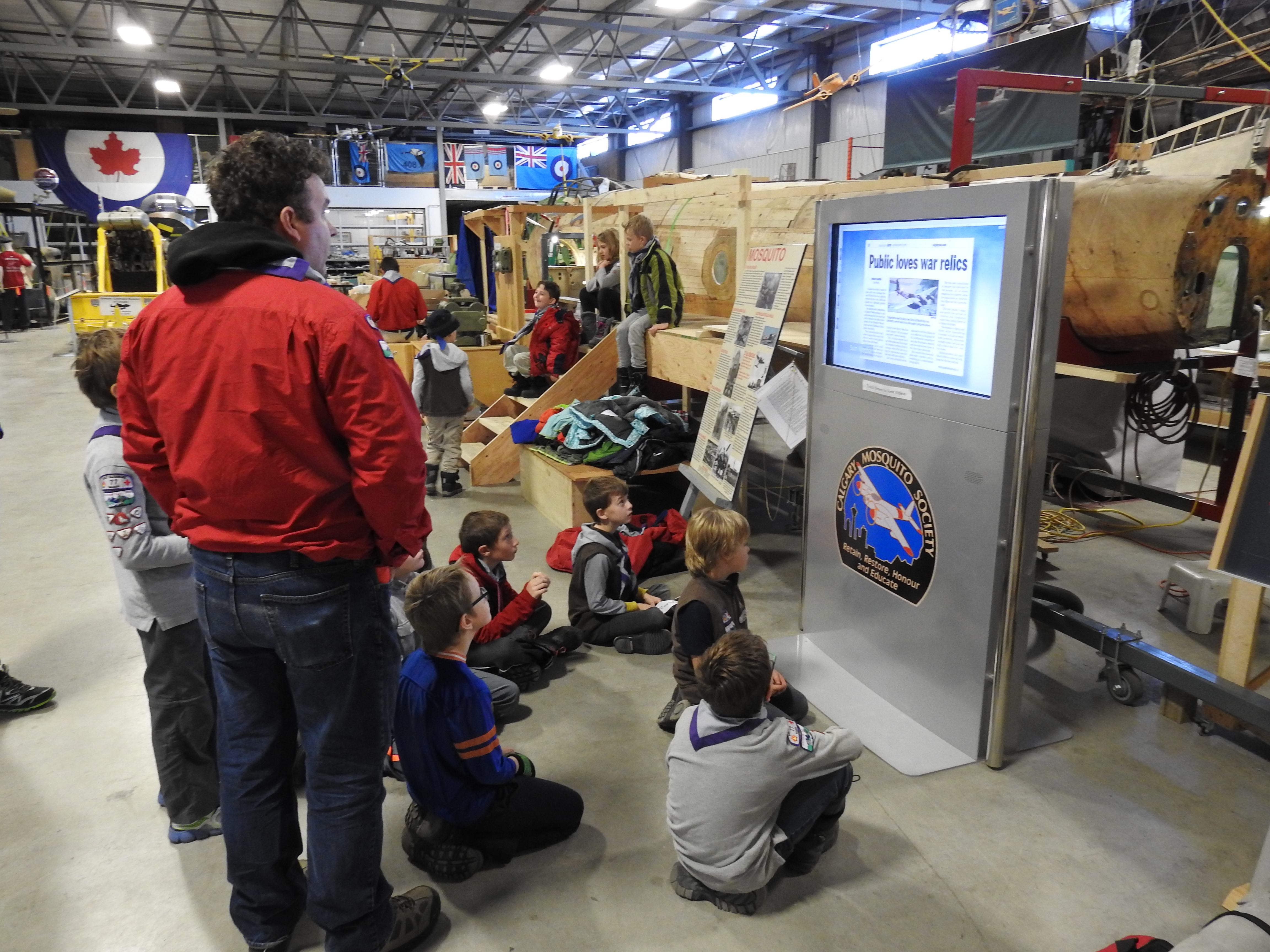 As usual, we spend much of the day talking with visitors before and after the morning ceremonies. This year's events also saw a troop of Beavers and Cubs from Calgary 'camping' overnight in the restoration area of the museum adjacent to the Mosquito.