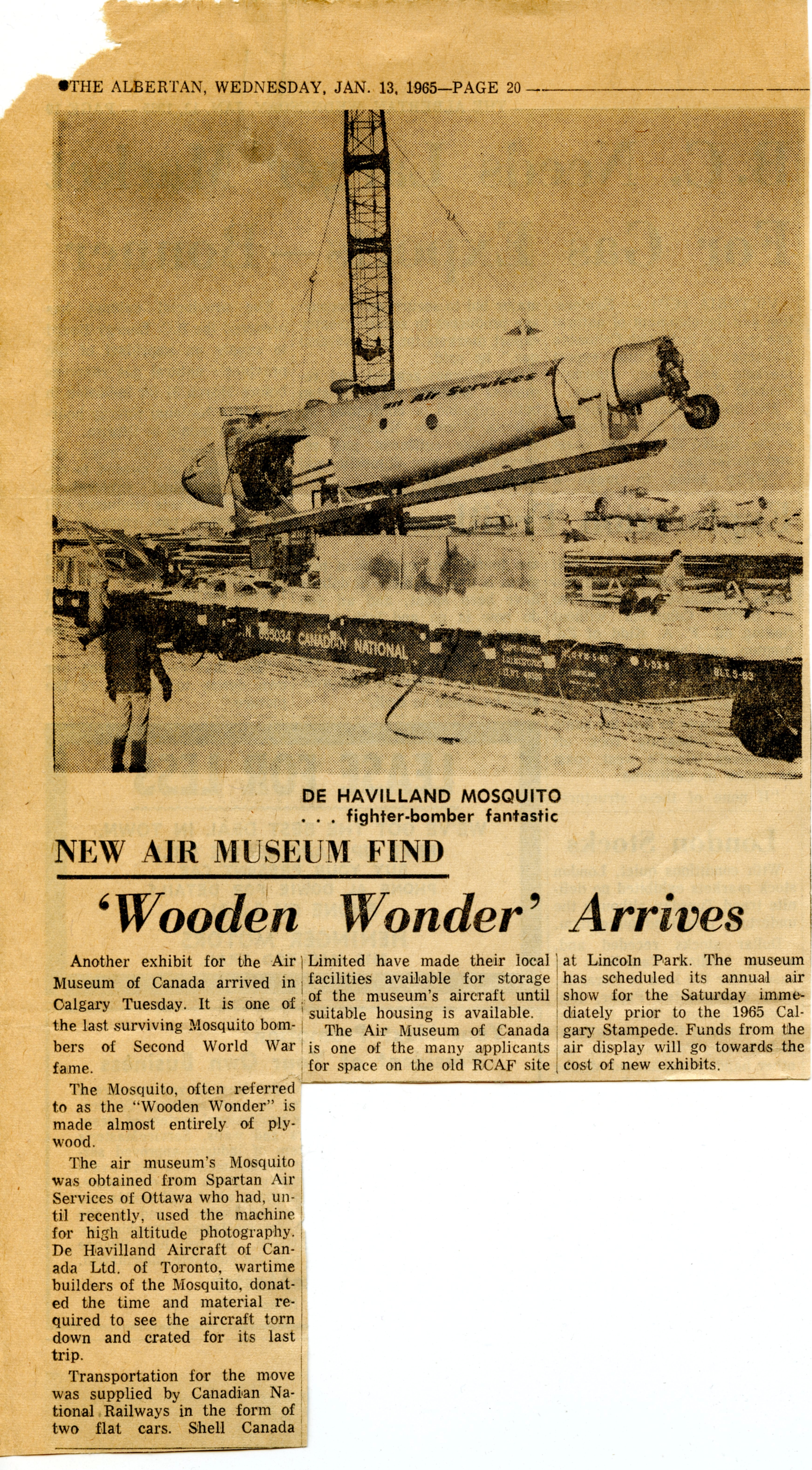 Late in November we received a tremendous donation of Spartan Air Services artifacts and documents from the Armstrong family of Calgary. Their father Neil was with Spartan for fifteen years, dating back to the early 1950s. The collection includes artifacts such as a Spartan jacket patch (in new condition), baseball cap and African style Spartan logoed letter opener (Spartan had mapping contracts in Kenya) as well as a wealth of documents including photographs, brochures, reports, letters, in house magazines and newspaper articles, a treasure among which is a Calgary Albertan article showing the arrival of our Mosquito in Calgary giving us, for the first time, its exact arrival date of January 12, 1965.