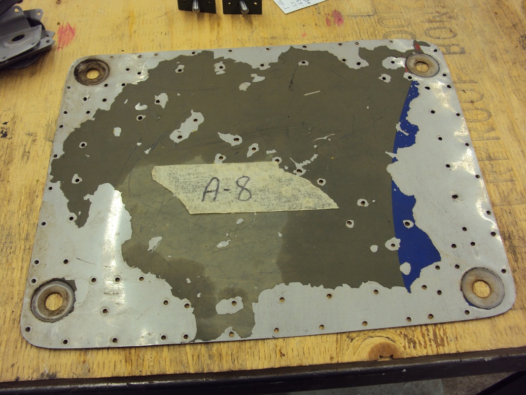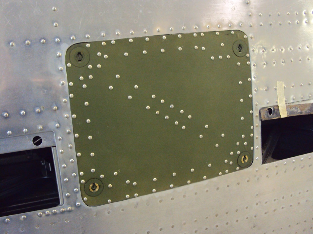 Inside, Janelle has installed a patch on bulkhead 5, Cam is repairing the internal skin damage on the hell hole door where the aft door striker plate was ripped out.