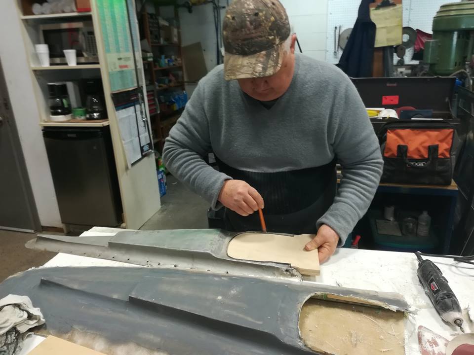 Roger and Peter have worked this area building an internal frame to support the skin shape, cutting out the bad material and preparing the new insert. The new skin will be bonded underneath the existing stringer and will be spliced to the old material.