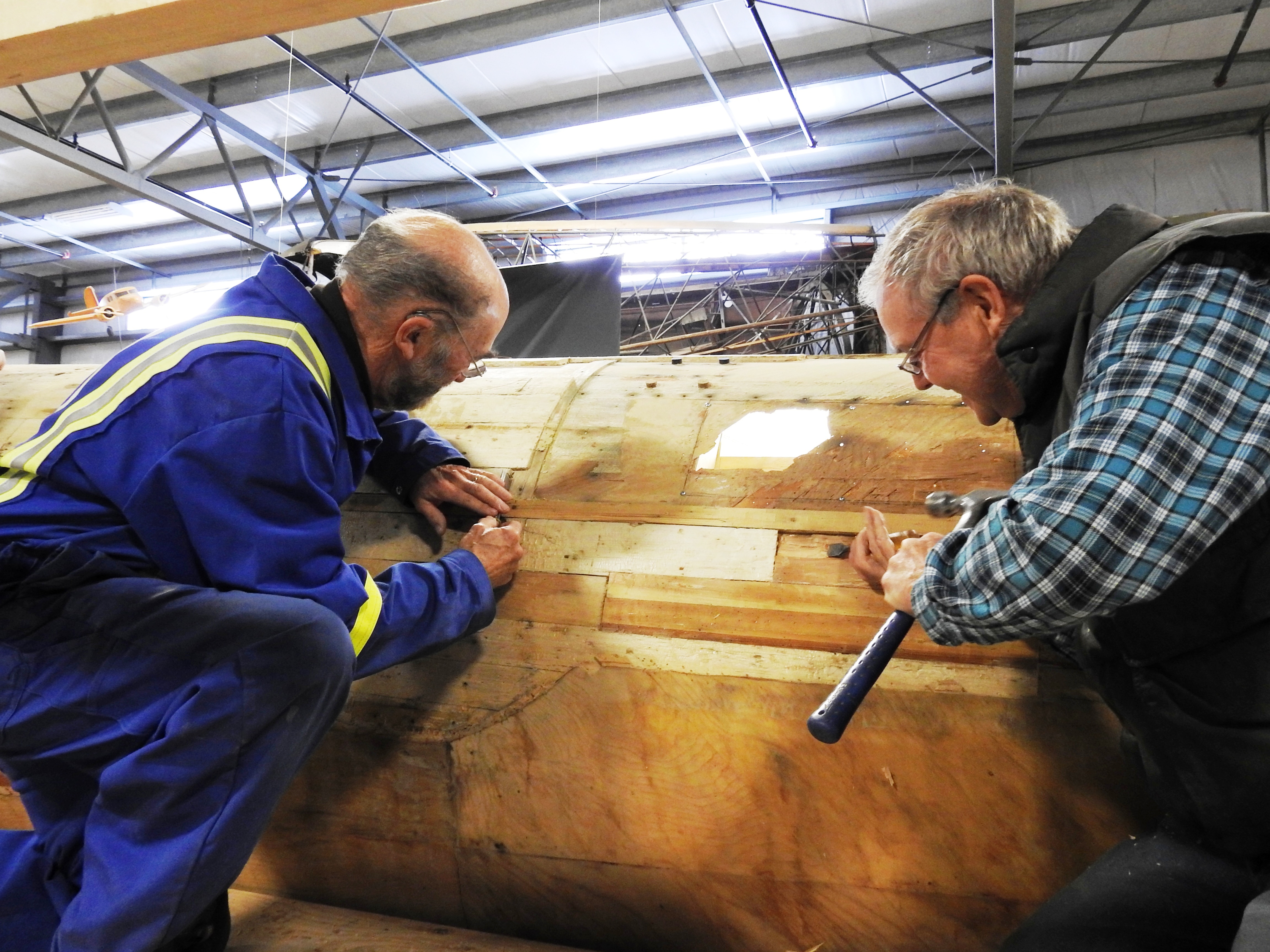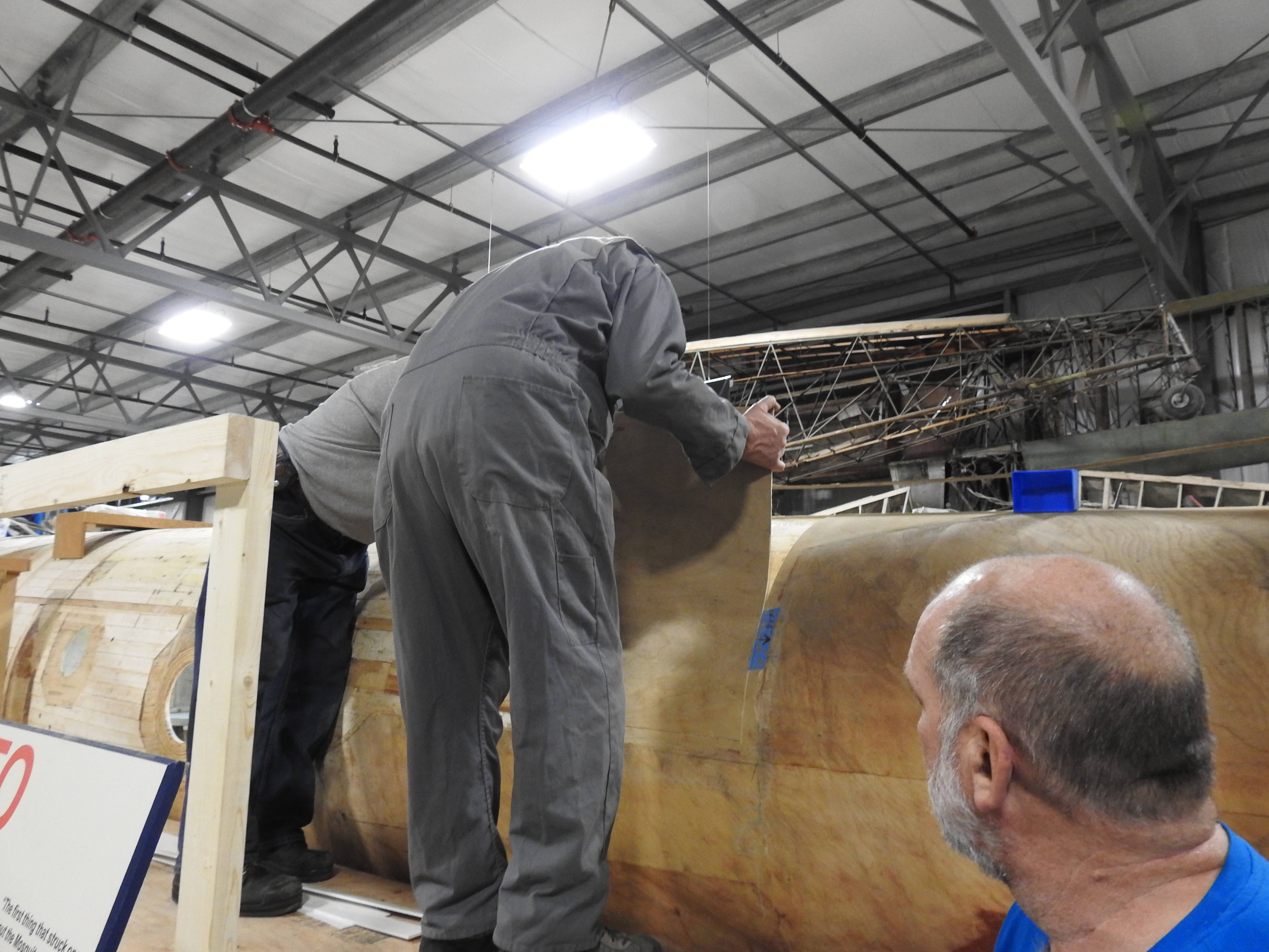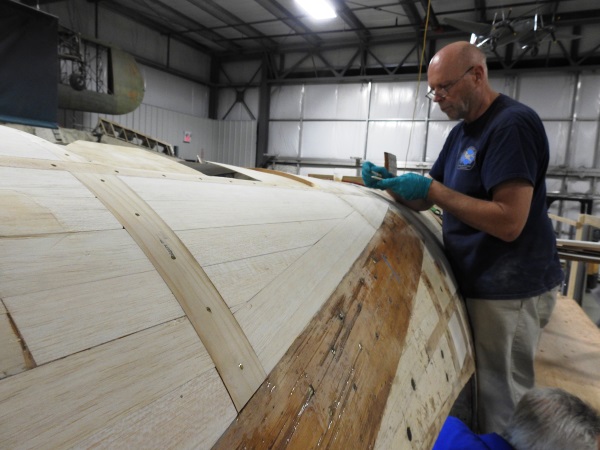 'The sins of the fathers': Here Jack supervises Cam and Don as they remove a large section of skin that was stapled in place by volunteers with the Air Museum of Canada back in the mid 1960s. Under the bogus skin we found an abundance of non-standard cedar in place of the balsa, as well as a badly damaged inner skin section.