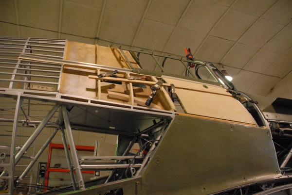 The largest and most visual progress this quarter was accomplished in completing the infamous doghouse assembly just aft of the pilot's head. In a better world where vendors cooperate, this critical part of the fuselage structure would have been completed much earlier in the process as it ties together so many critical components and areas of the upper fuselage such as the upper formers and stringers, the canopy, windscreen and pilot access doors. Not having the pieces or information to complete the doghouse meant working on all of the related parts and components, with this last of all. As outlined in previous reports, we were finally able to complete the doghouse and related parts through the assistance of several parties including Ron Taylor and Brian Davis, both located in southern Ontario.