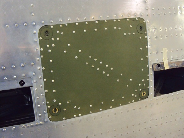 Moving aft on the port side of the fuselage, our last piece of bogus skin patching has been removed. Again, this is work that was done after the airplane arrived in Calgary and was in the care of the Air Museum of Canada. It represents the largest patch on the aircraft and the last piece to be removed from the left side of the fuselage. The damage was similar to other areas we have worked on, with poor bonding resulting in delamination, more staple holes, small areas of rot, missing material and last but not least, more cedar below the skin where balsa should have been used.