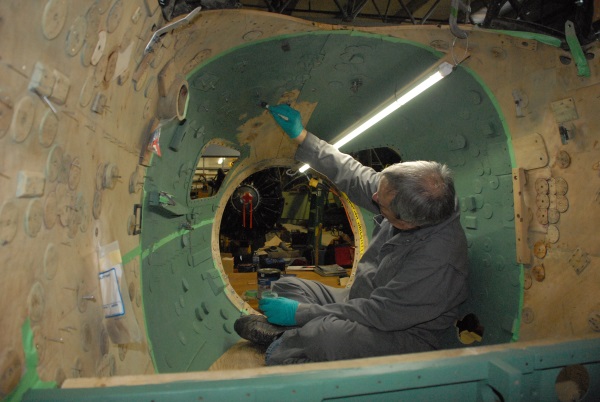 Upper: We reached a significant milestone in starting to paint the interior of the nose and cockpit area which means all the structural repairs in this area are complete, all damaged ferrules replaced and we can now start to reinstall restored components. Lower: Not quite the ceiling of the Sistine Chapel, but Michelangelo (Don H.) takes similar pride in his work.