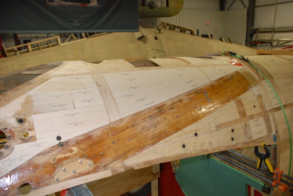 Although the new balsa wood will be completely covered by the outer skin, we use a permanent ink stamp which reads "Calgary Mosquito Society 2009" on all new material added to the airplane. This is in alignment with best practices, which for future reference will identify and distinguish from original all of the work done and new materials used by our organization in the restoration process.