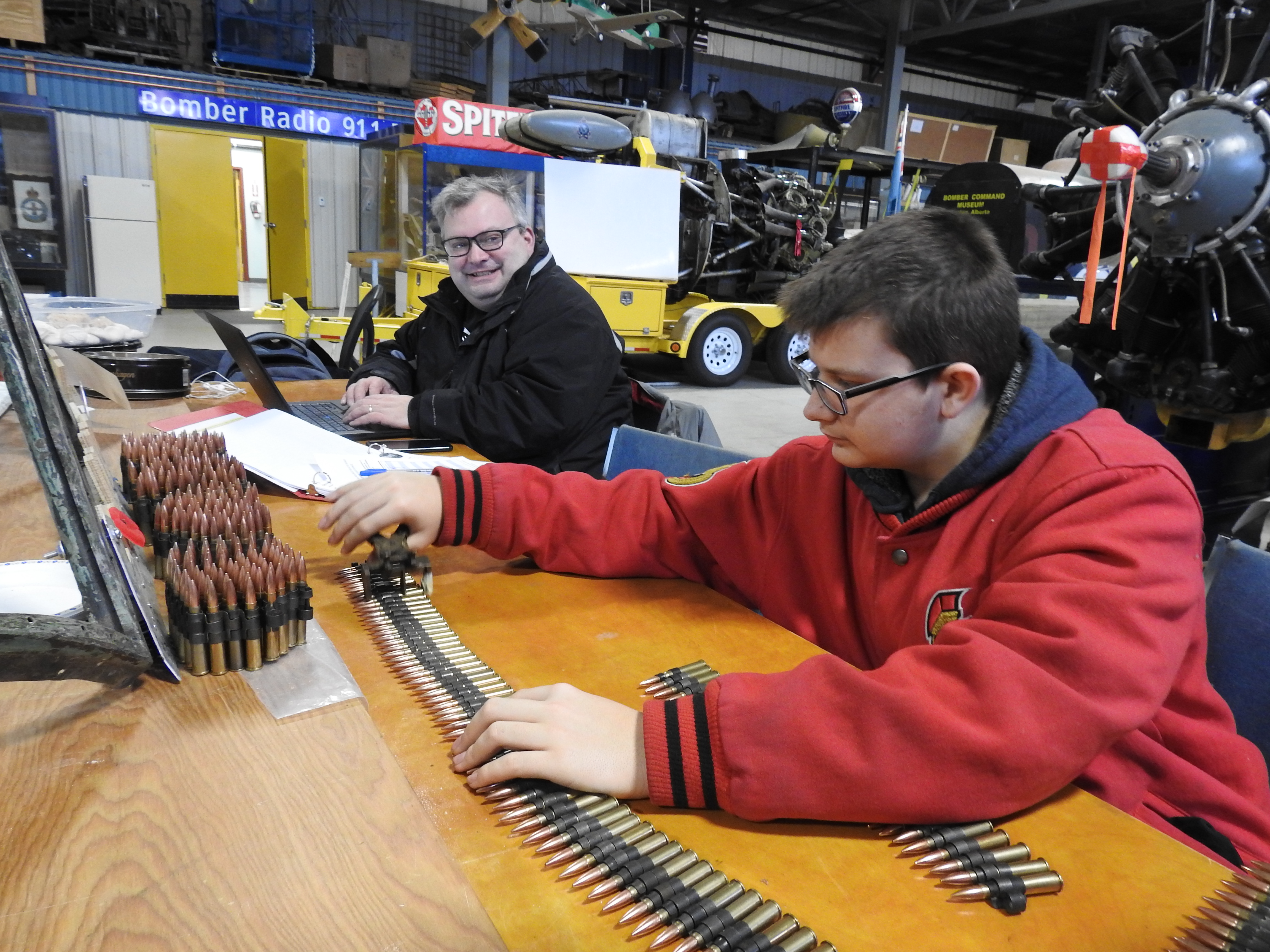 Dave C. watches his son Geoffrey load .303 rounds into clips with an authentic WWII vintage tool to make up ammunition belts for the guns in the Hurricane.