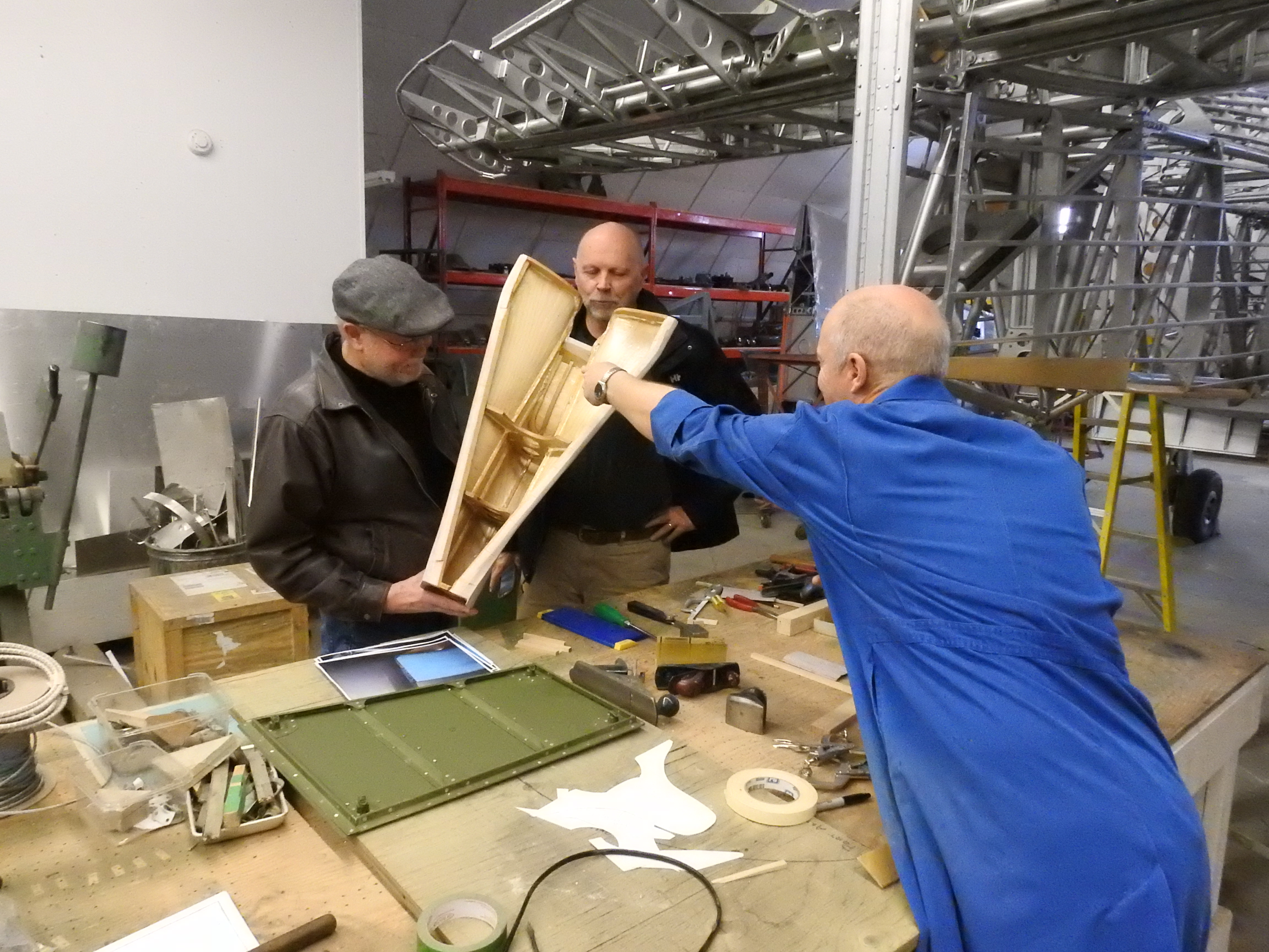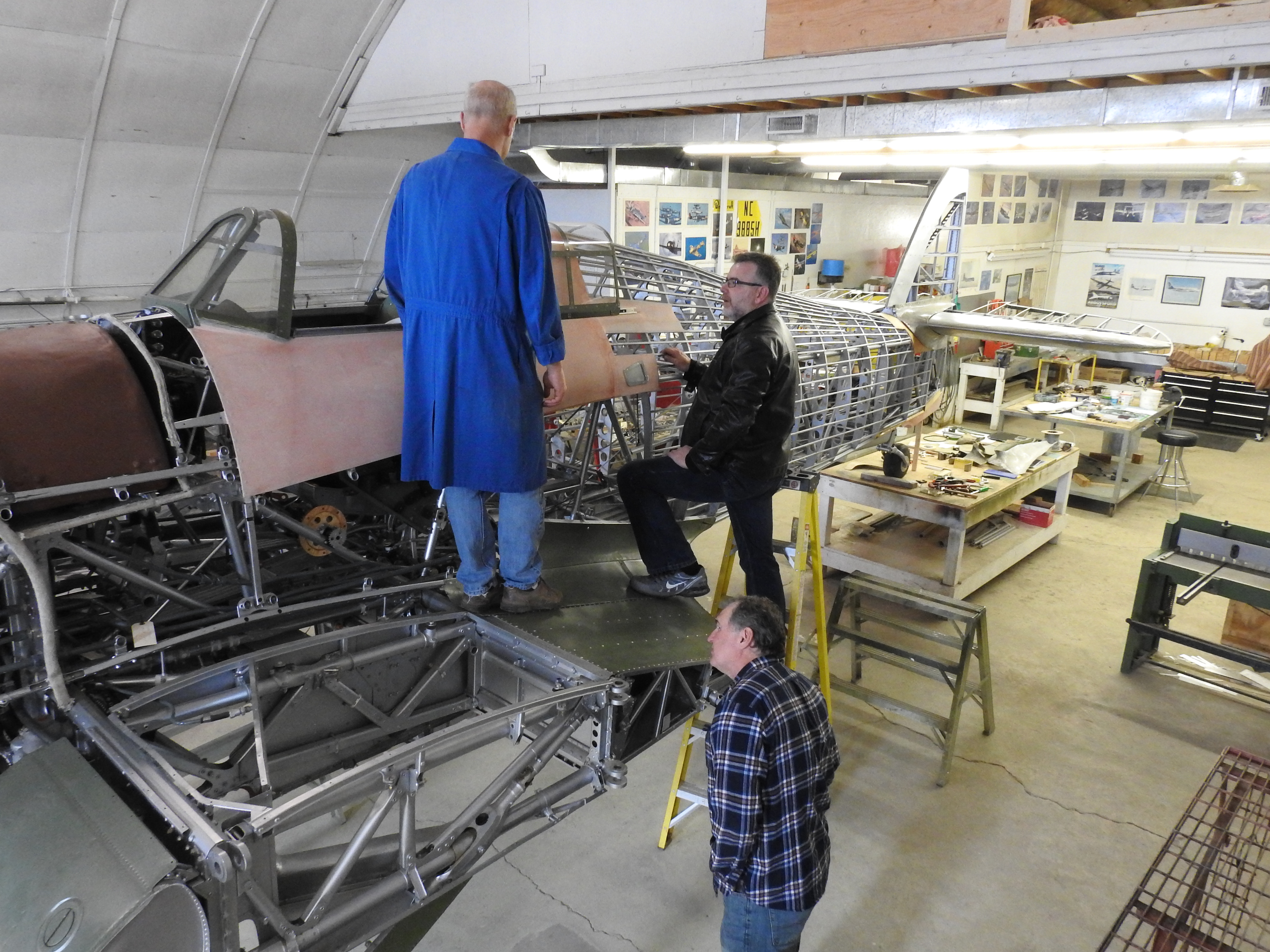 Byron R. and Andy W. admire some of Greg's handiwork in building from scratch the lower rear fuselage fairing for aft of the tail wheel. Lacking both original parts and drawings, Greg used the airframe as a jig to build the new piece.