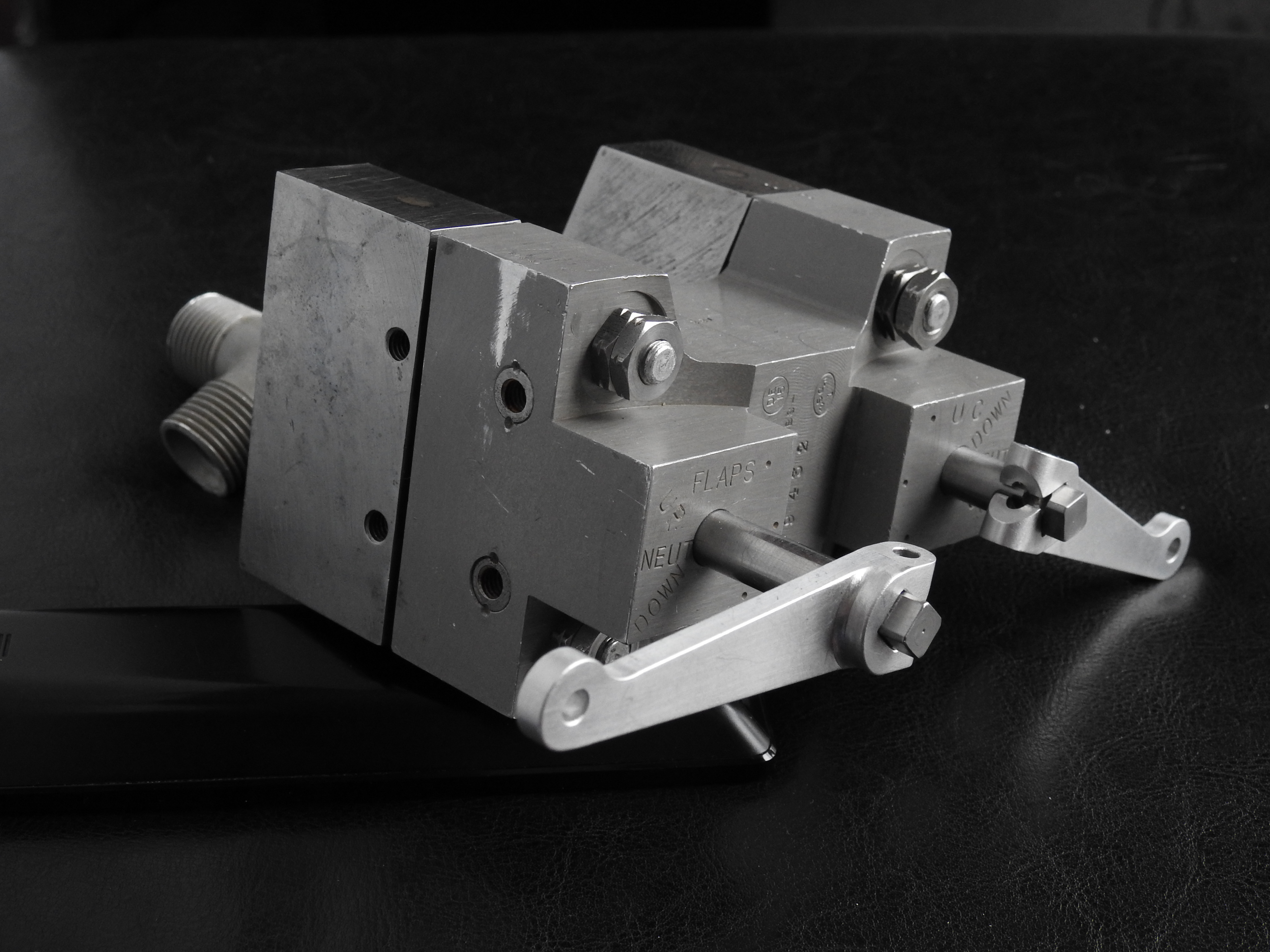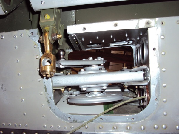 The aileron bellcrank assembly, another component that has dogged us since the start of the project. Failing to locate one, HASI used one as a pattern to manufacture a second for the opposite wing. The brass fitting on the upper left is milled from raw stock, requiring thirty seven different operations.