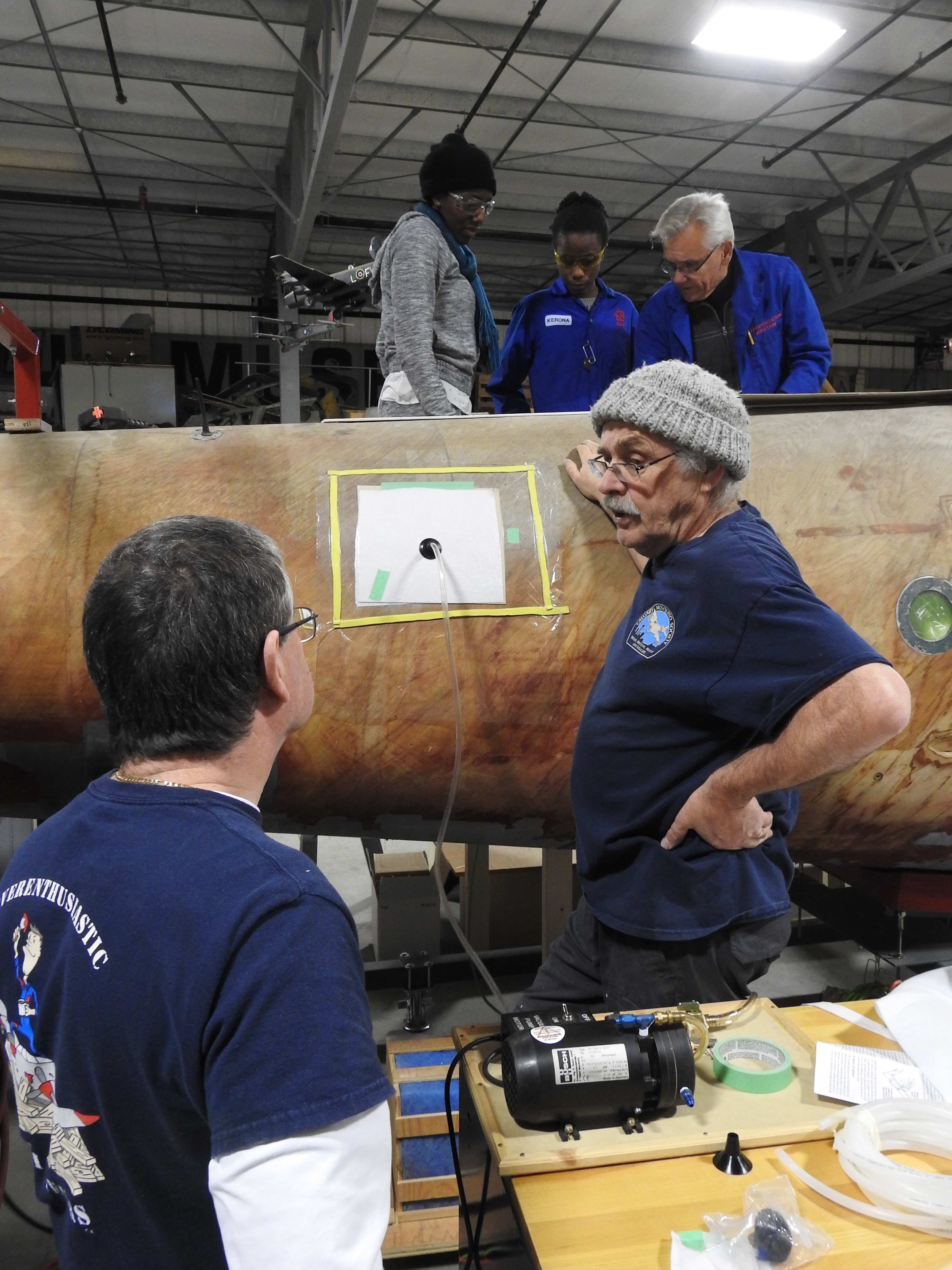 Gary T. experimenting with vacuum bagging new skin to the fuselage. Michael H. looks on as SAIT students Janelle and Kerona take some instruction from Dick S. above.
