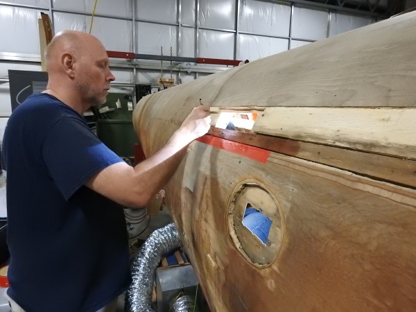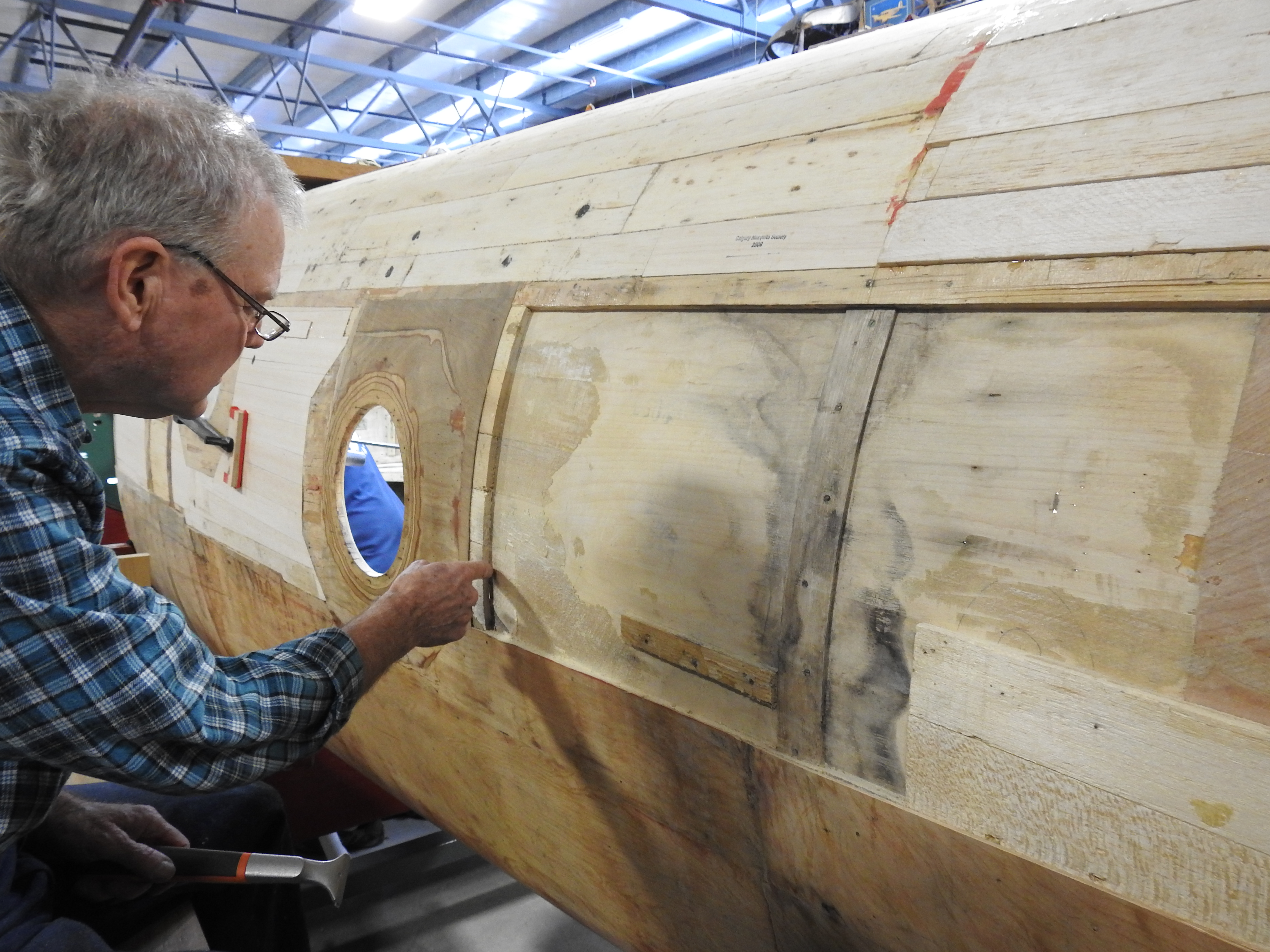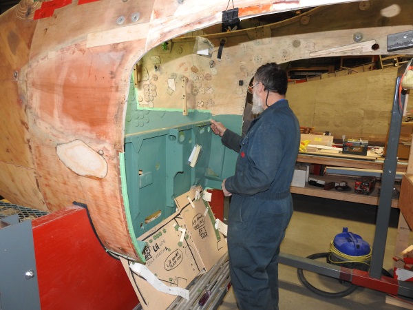 Roger examines the inner skin of the rear port side fuselage to determine how much will have to be replaced due to water damage that has rotted the wood and weakened the structure.