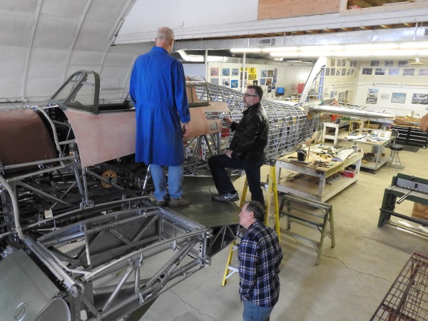 Visiting from Australia was historian and author Ken Wright (top) and in the bottom photo HASI engineer Greg Davis talks to visitors Brian Davis and Darrell Brown who came out from Ontario to inspect the Hurricane in support of their own restoration projects.
