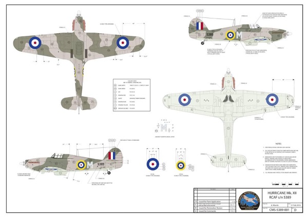 The result of over two years work in concert with some of the finest historians in Canada, the UK and the USA. Thanks to CMS board member Andy Woerle, this four plan view of the precise colours and markings for the Hurricane, detail for HASI exactly how to finish the airplane.