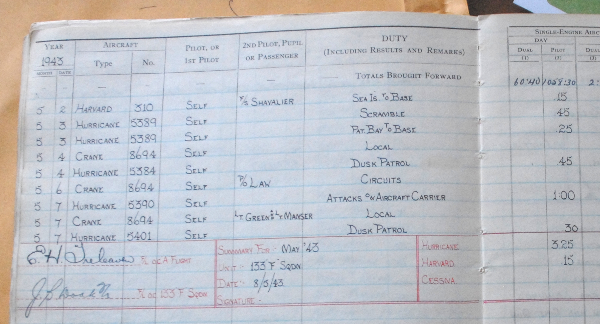 One page of Don's logbook for May 1943 has two entries on the 3rd where he flew Hurricane 5389 twice: once for a 'Scramble' and again the same day for a flight from Patricia Bay to Boundary Bay, BC.