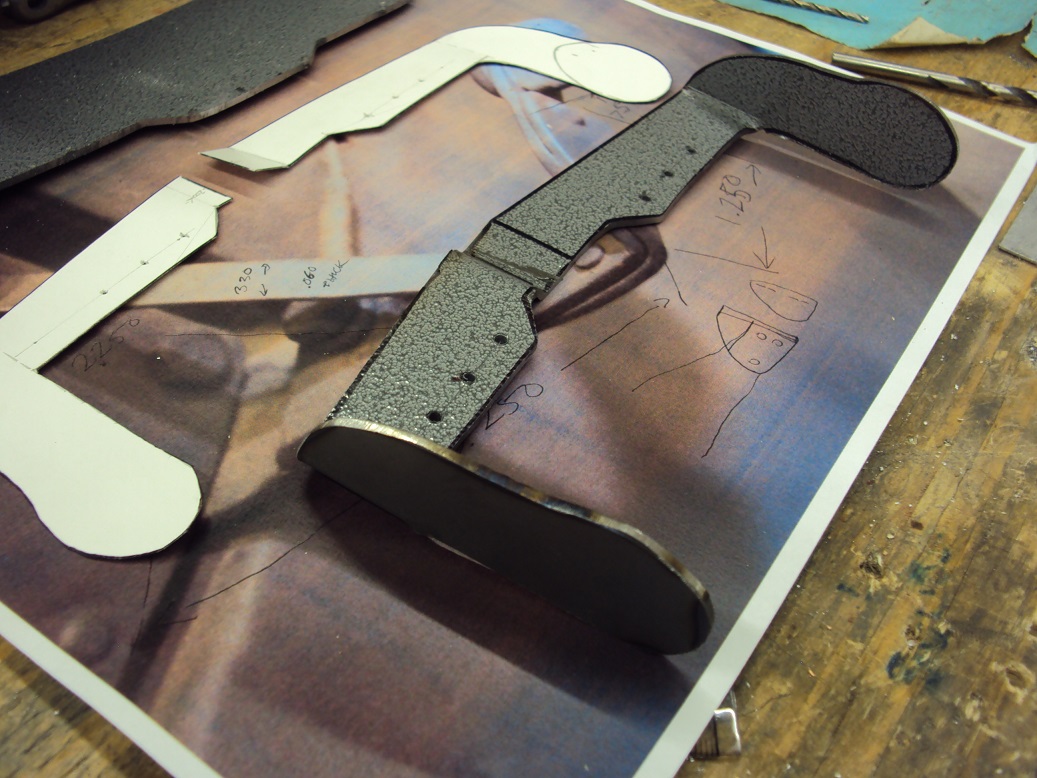 Read the line above the photos again. Try to imagine the number of hours and the skill set required to accomplish that. Here are just a few photos of the process. Upper: Starting with a paper pattern, and then cutting the actual piece from sheet steel. Lower: Painted and adding the forward facing arms which hold the weights. Note the 'step' in the horizontal arm.