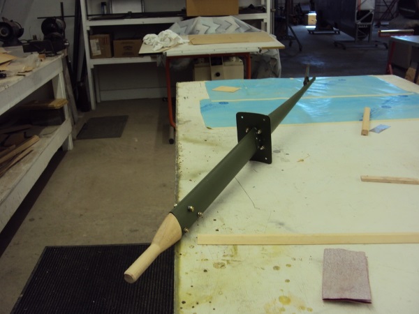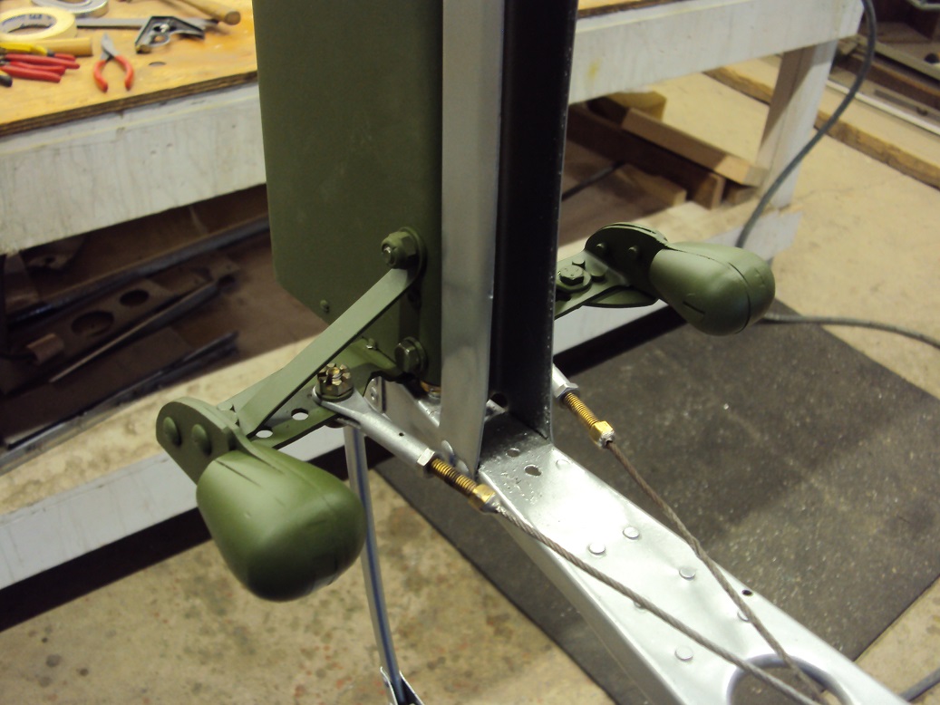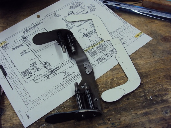 Installed on the rudder with angled reinforcing strips and counterbalance weights. Note that the horizontal plate has a 'step' in it to allow the trim cables to cross without rubbing, as seen in the lower right of the photo.