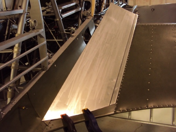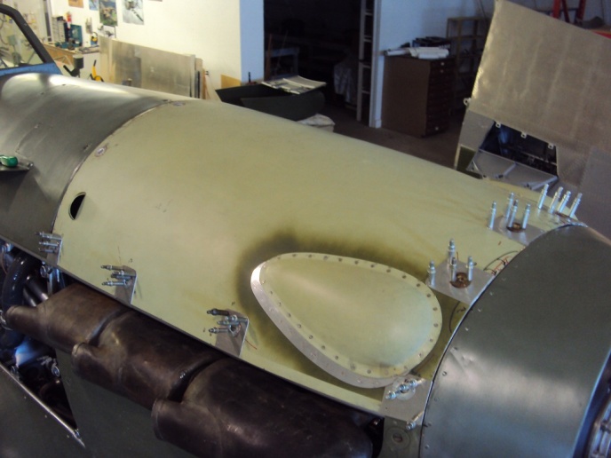 Well it almost fits... The top cowling was not original to the airplane, but was manufactured at some time as part of an earlier 'restoration' effort. It did not fit. Lower: Moving all of the fasteners and the cowl 'bumps' as well as shortening the front of the cowling panel.
