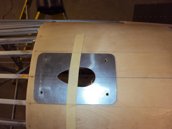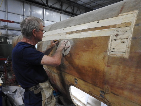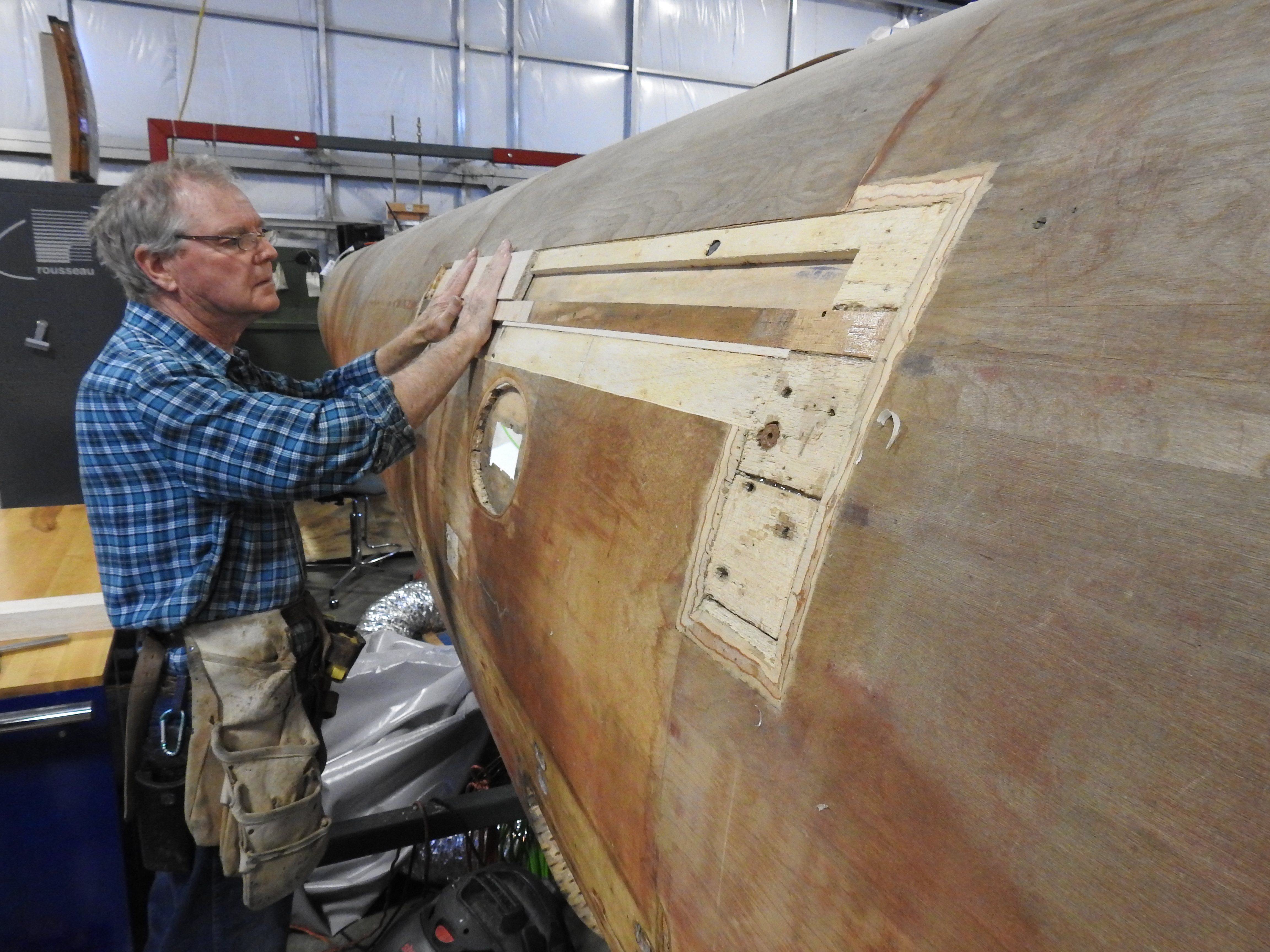 Gary T. shows off some very tricky work in the way of a new exterior skin patch that has been scarfed on three edges of one surface and on one edge of the opposite surface. Gary applied his considerable skills to create a 12:1 scarf on 1.5 mm, three ply birch. (The birch runs ~$800/sheet).
