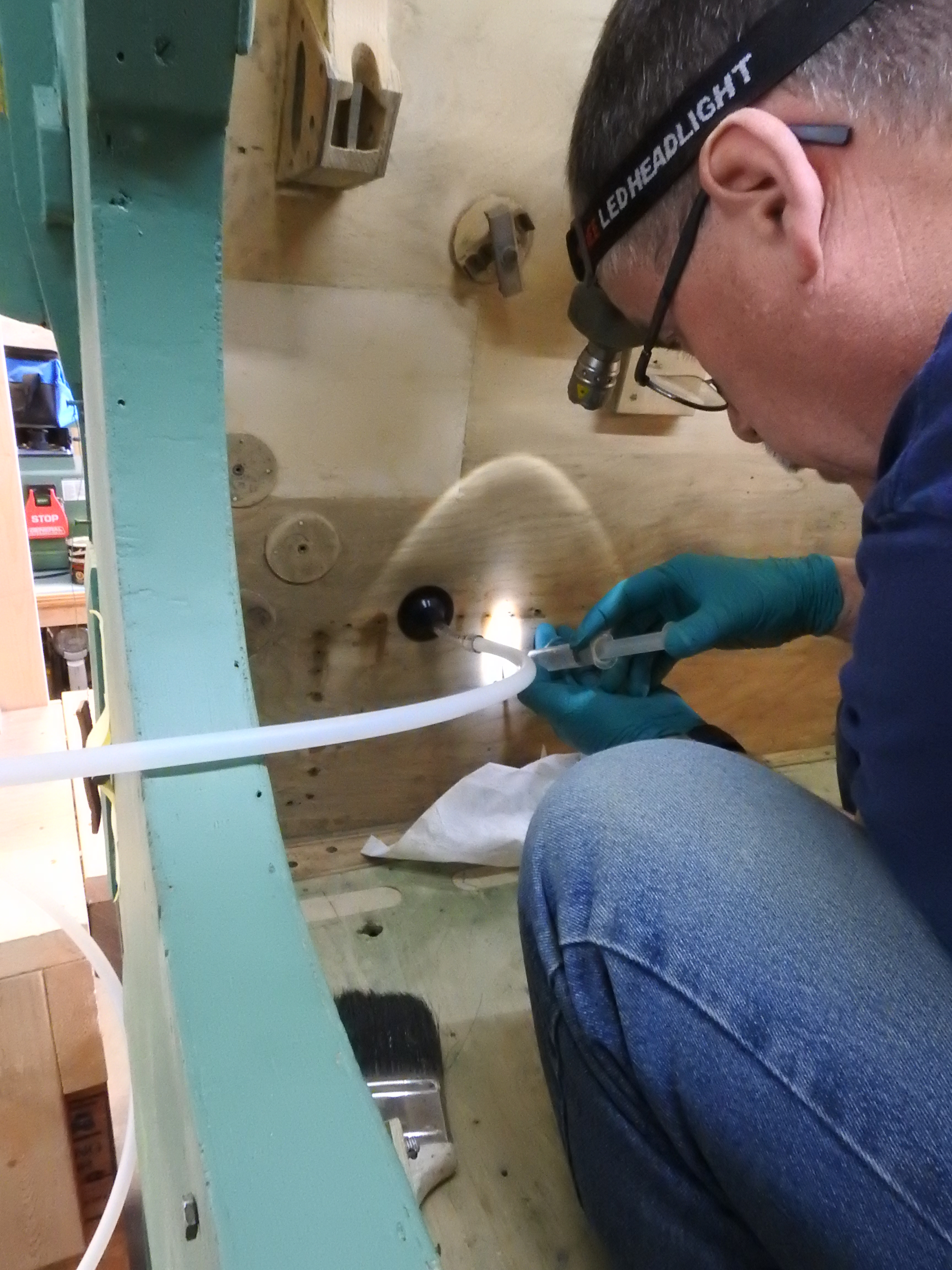 Using a vacuum line to a small hole on the inner skin, Michael H. uses a hypodermic to inject a thin epoxy in areas of the fuselage where we suspect that the original adhesives are no longer holding. This method allows us to strengthen the monocoque structure without having to open up the inner or outer skins; a process which can be very labour intensive with a high degree of risk to the original structure.