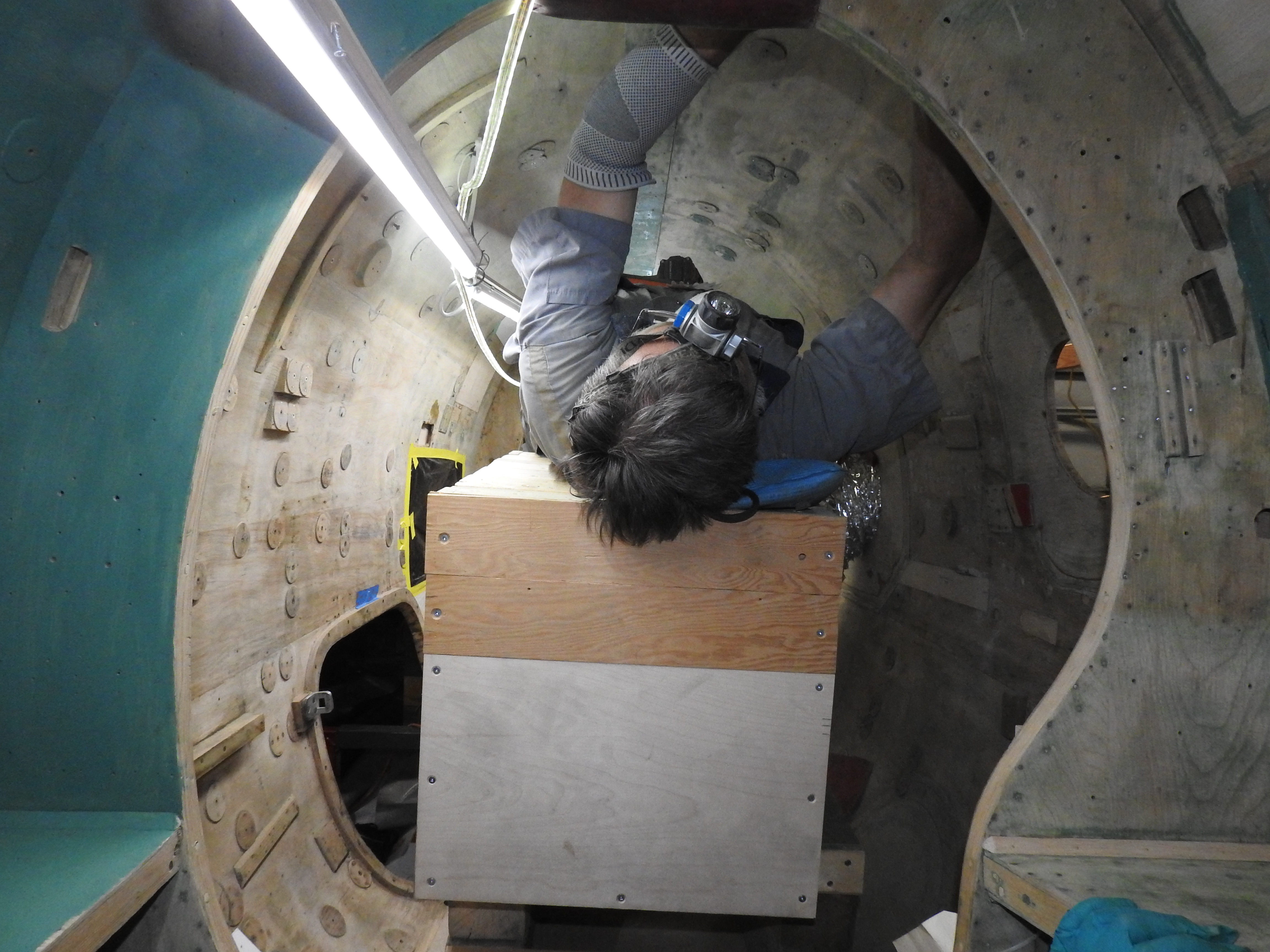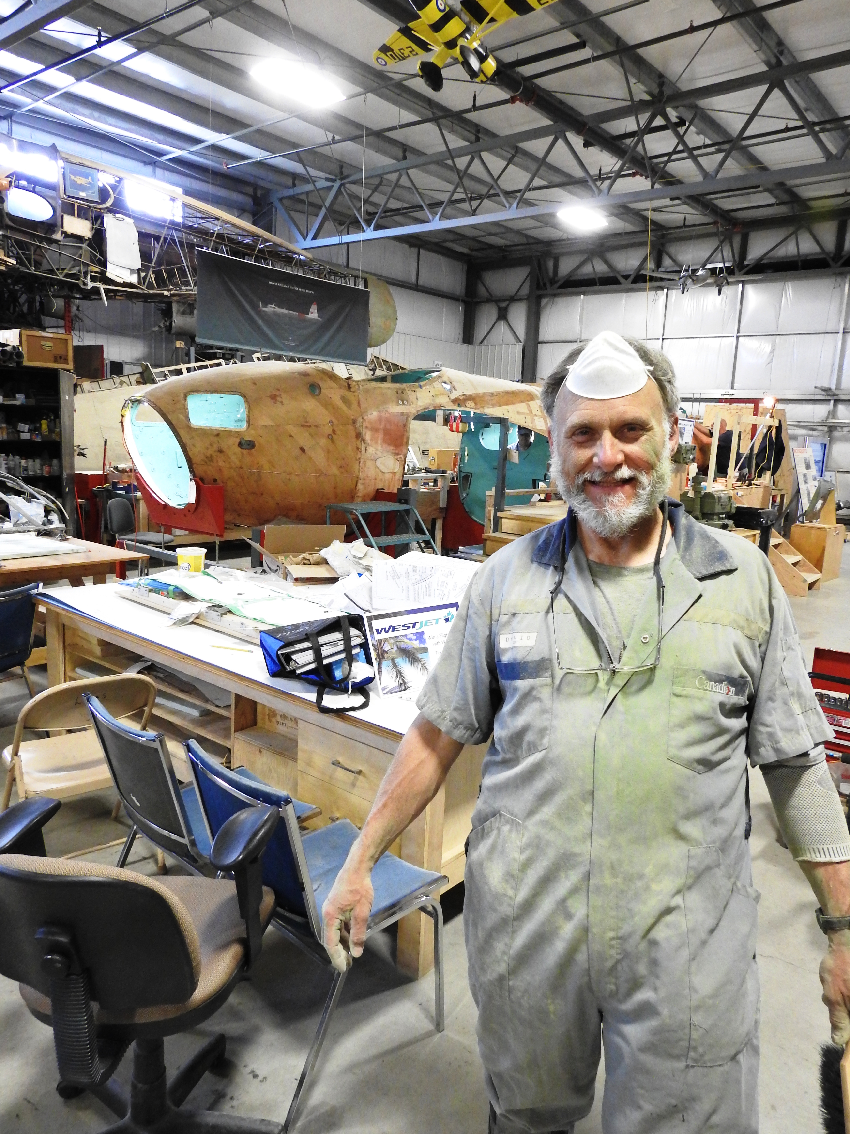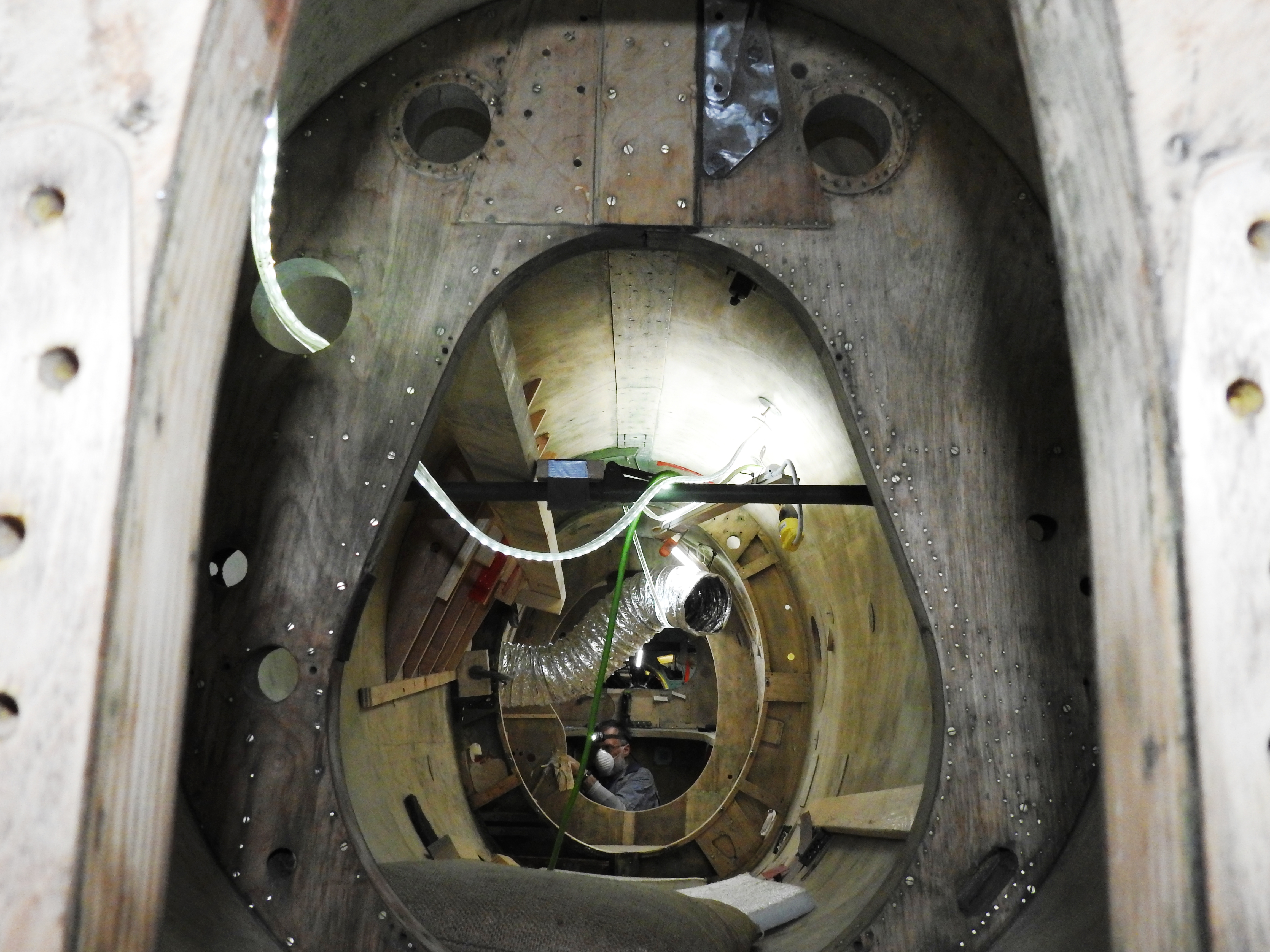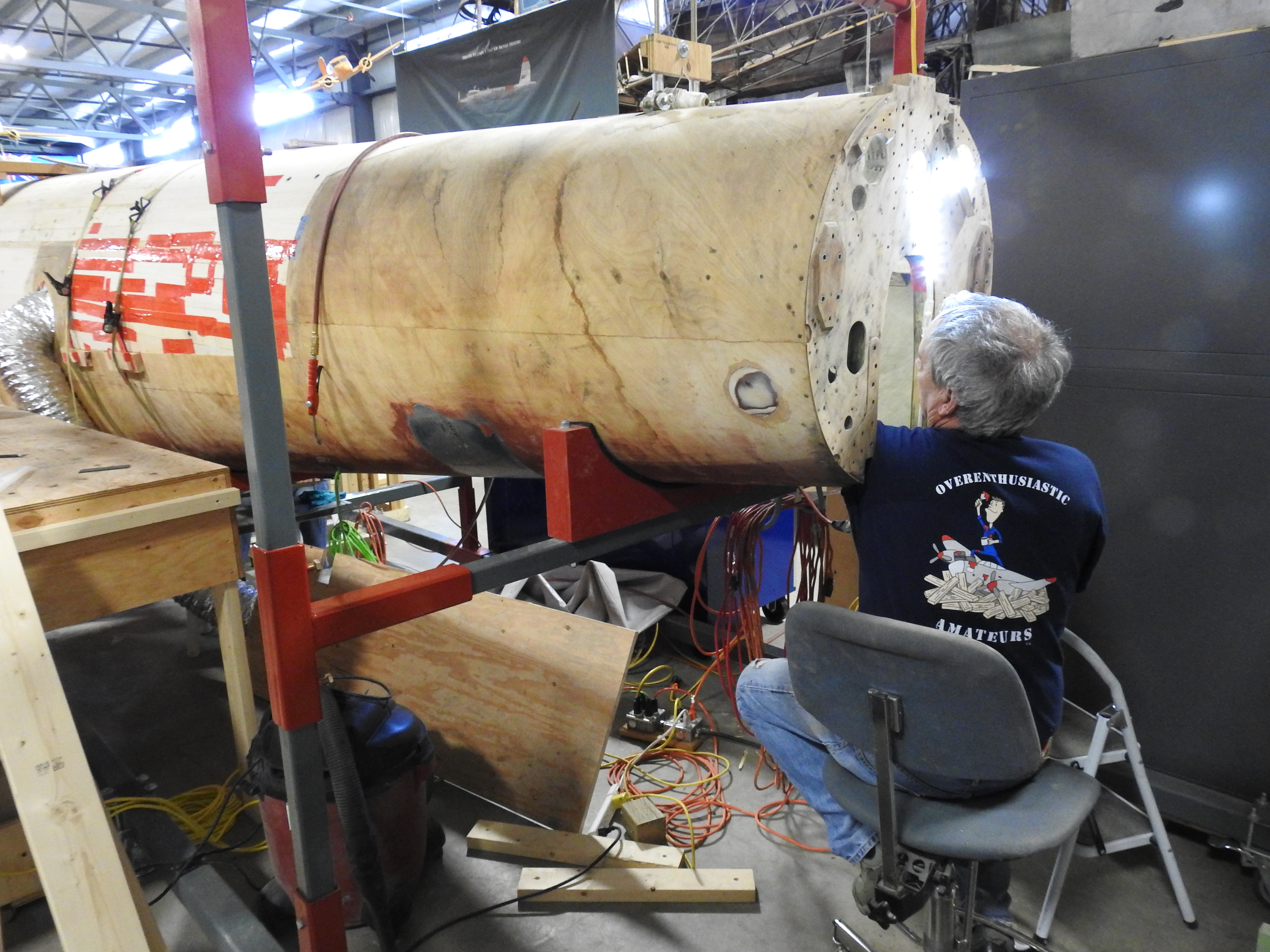 Don H. works in one of the awkward spots to clean and remove paint and +70 years of grunge from the inside, rear fuselage structure. Room for only one arm at a time.