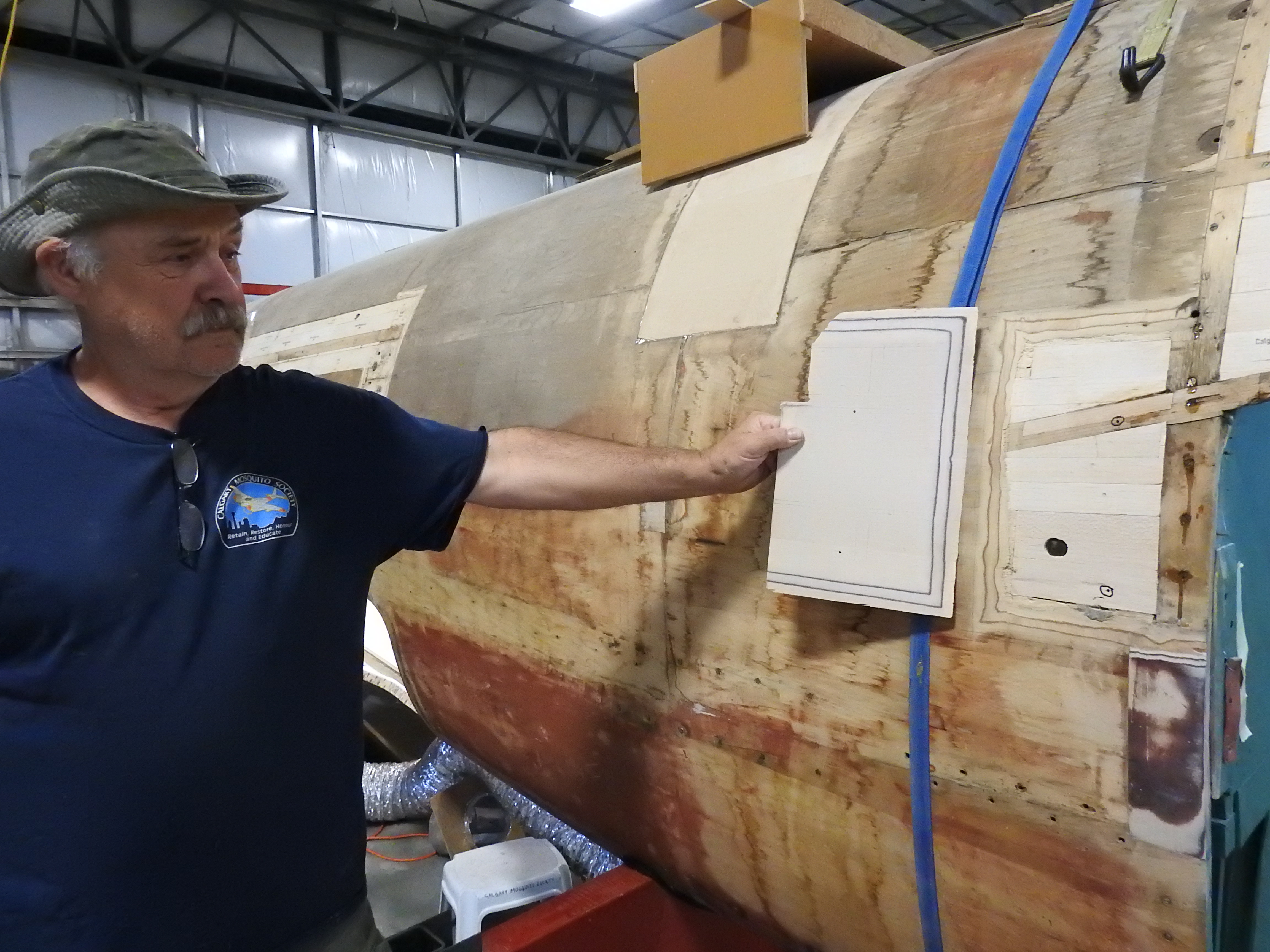 The vacuum bagging is our hope for installation of the outer skins that gives us the most control with the best consistent finish, but we struggle with the high leak rate on the bagging. We have also learned that bagging the inside of the fuselage as well as the new outside skin at the same time will give us some added vacuum pressure. We were able to get to 22 in. Hg on a small area patch, but the question becomes how difficult is it to scale up from what we have done. Bear in mind we are pulling a vacuum on balsa, old dry wood, and loose glue joints with the inner skins riddled with nail holes.
