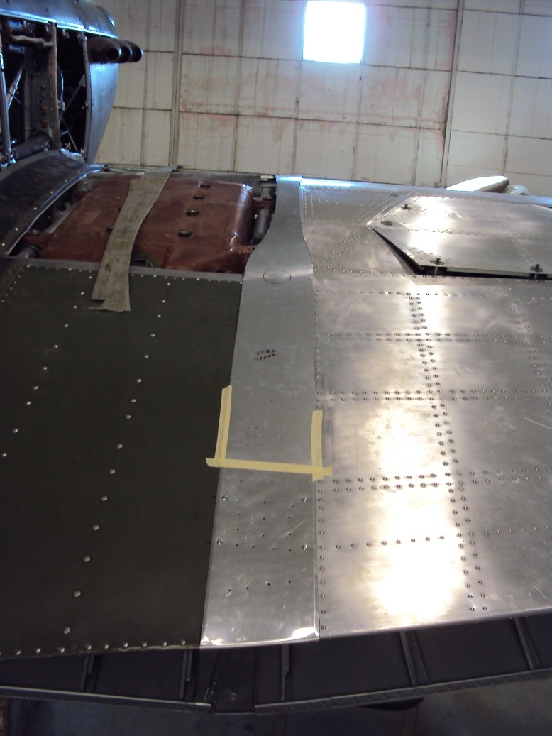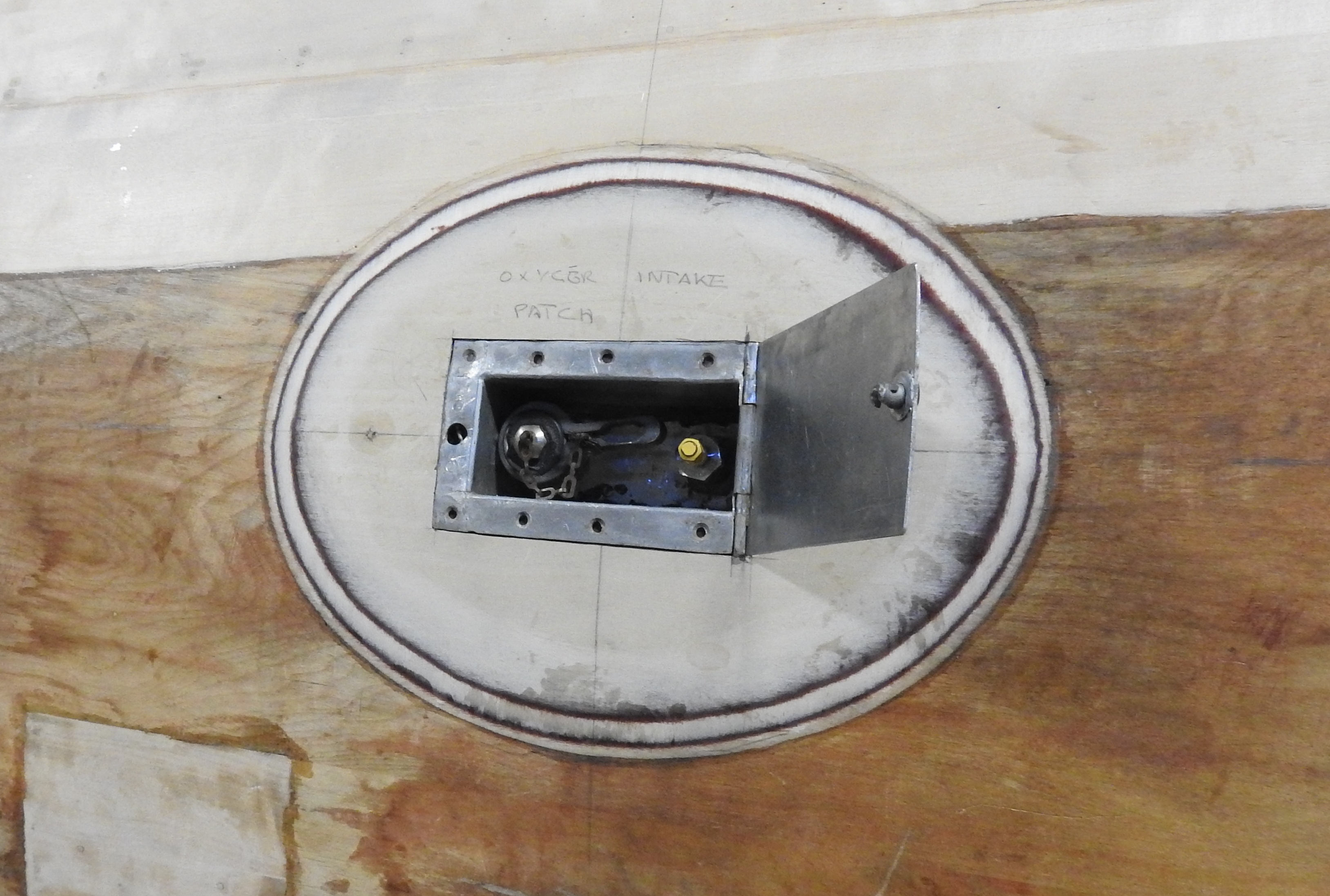 After: Stringer repaired. Balsa replaced. Oxygen fill port area repaired. Ten new skin patches installed. Note that the large patch is comprised of six separate pieces in order to match the original seam lines in the external skins.