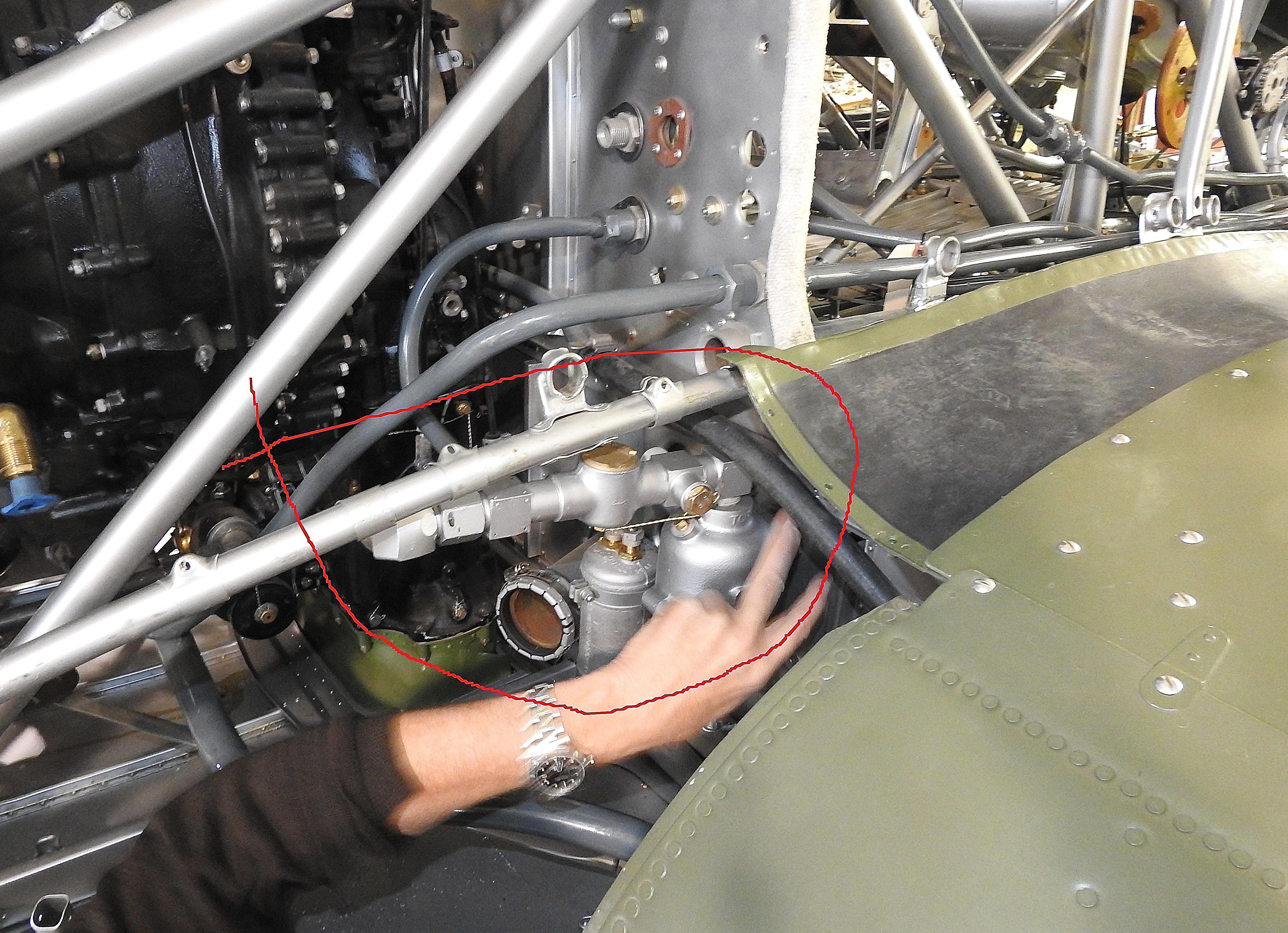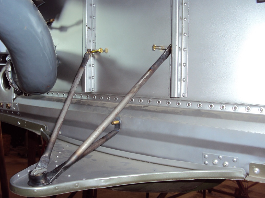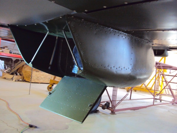 The radiator and oil cooler scoop door being fitted and rigged. The door was needed to regulate the amount of air flowing over the rad: open on the ground, closed in the air.