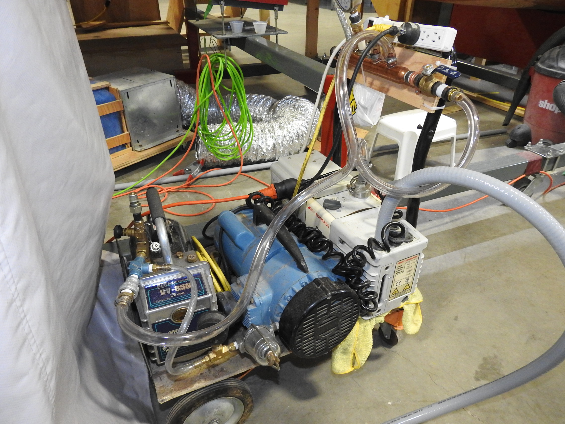 Three vacuum pumps pulling 23” are used to attach the new skin patches. Along with the pumps are a splitter, reinforced tubing and (learned the hard way) an exhaust line for the pumps that gets vented outside the hangar.