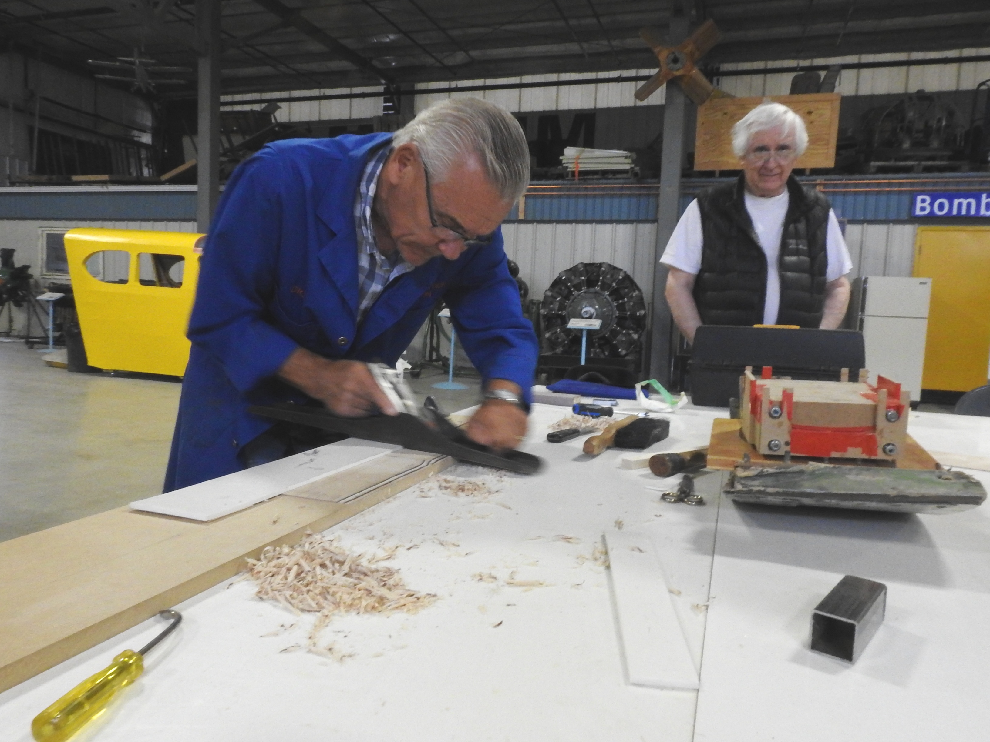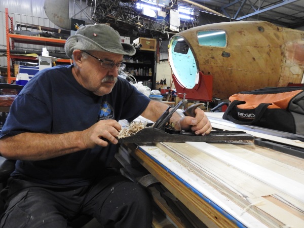Gary and Dick have worked to solve various scarfing problems both on the aircraft and on the new skins to be installed. Because the fuselage is both round and tapered, the contours change so one size does not fit all. We have been using a router with a special shoe to cut the scarfs on the new skin patches. The scarf is then completed by hand with a chisel and sandpaper. The scarf on the new skin patches is completed by first stapling the plywood flat to a jig, using a guide for a plane.
