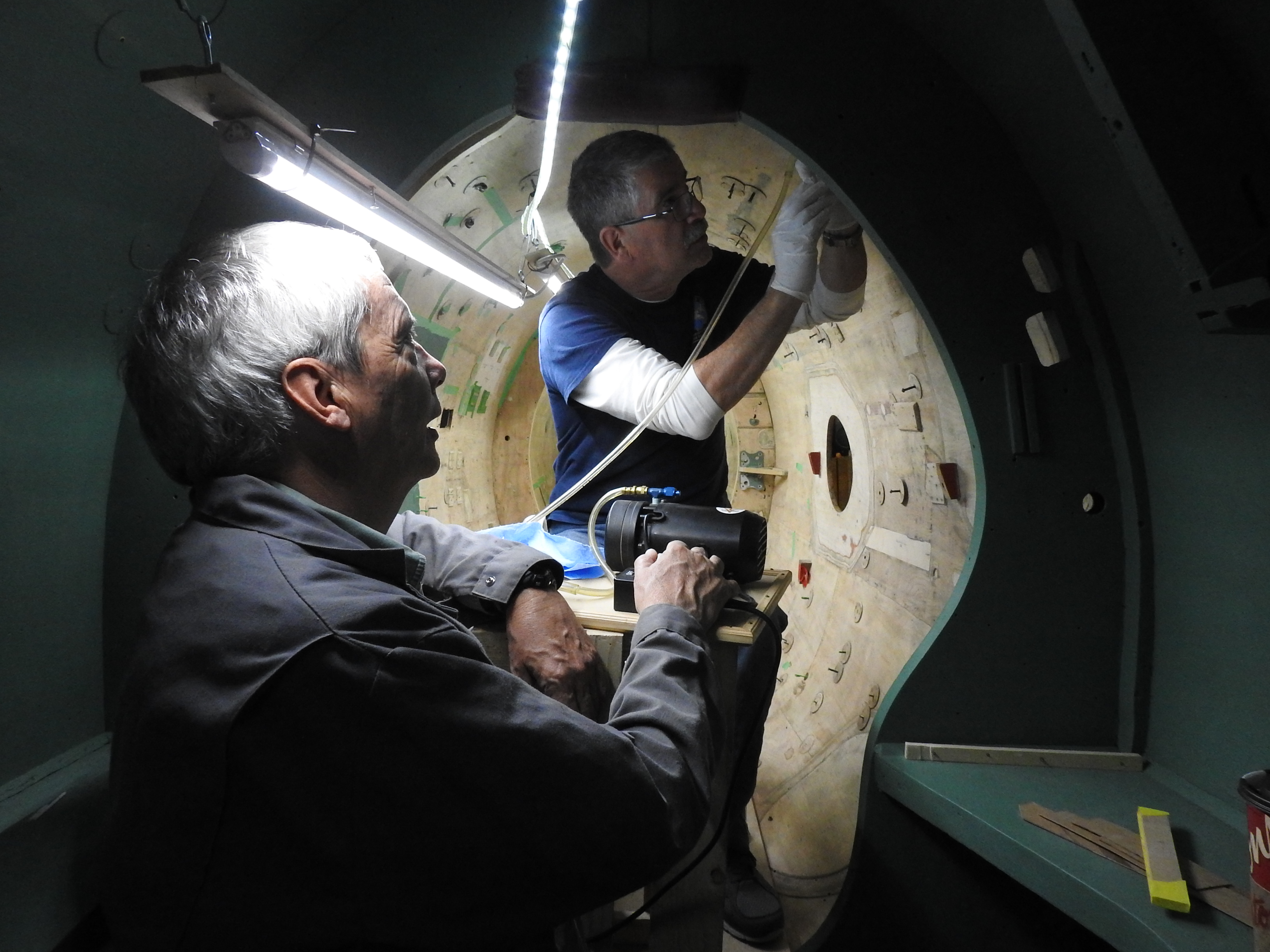 Don and Michael using the syringe and vacuum line technique to inject epoxy into the inner skins of the fuselage just aft of the camera bay.
