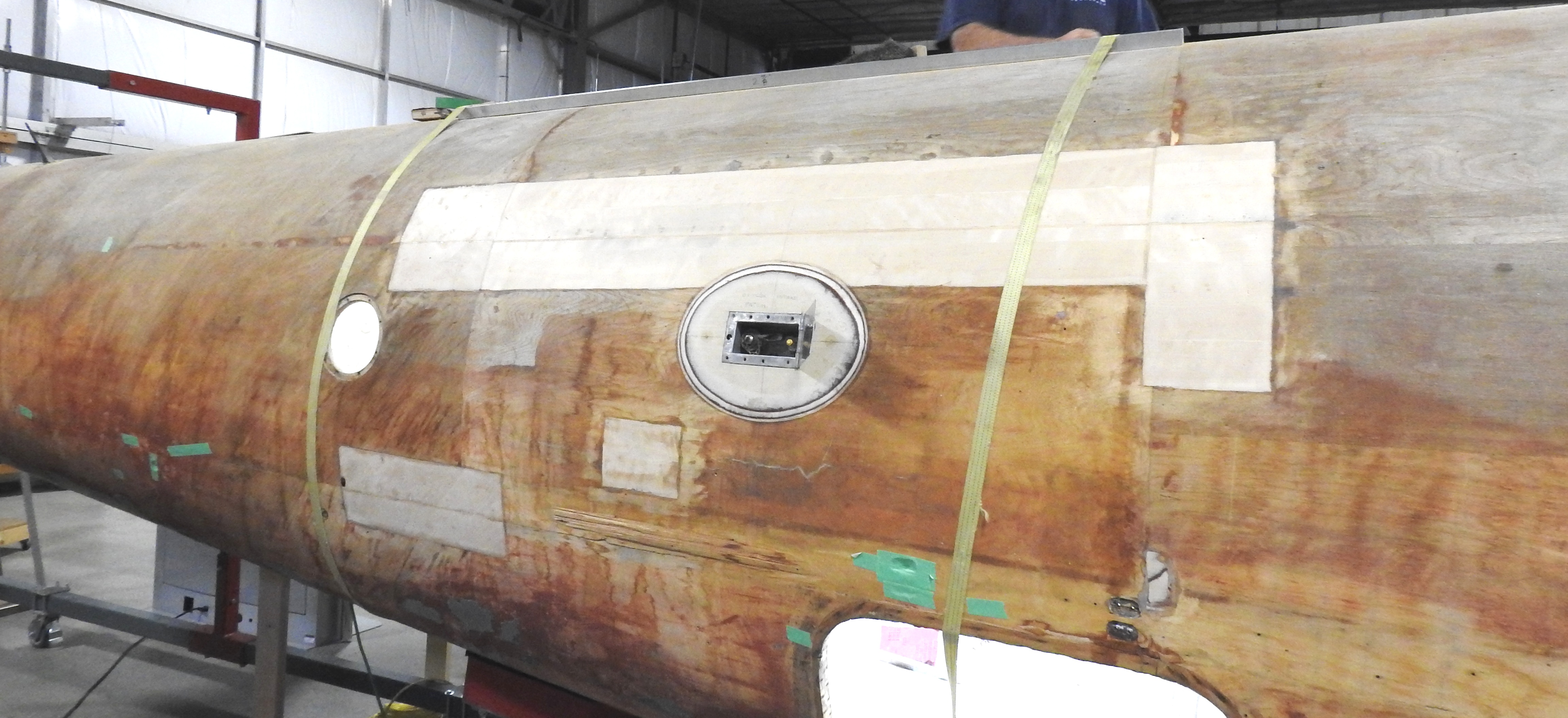Before: Right rear fuselage area with impact damage and a cracked stringer, delaminating skins, water stains and dry rot.