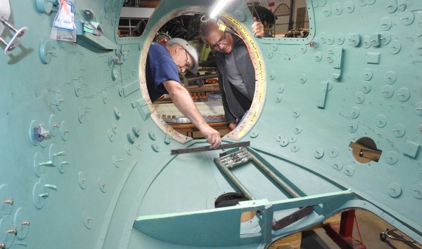Gary and Dick check the telescoping crew access ladder for clearance in its storage compartment under the cockpit floor. It is such a tight space that it fits only one way. Our thanks to the Windsor Mosquito Group of CH2A for fulfilling this item on our wish list.