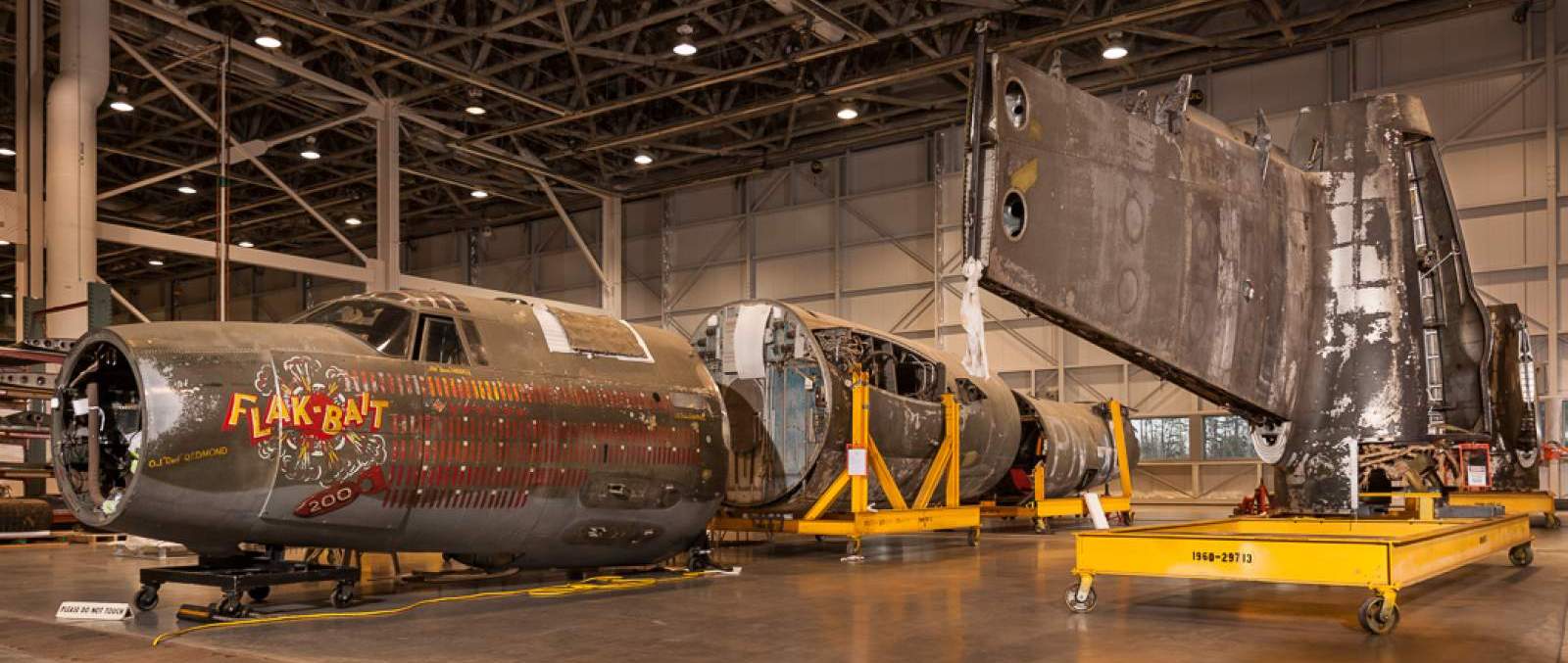 The Martin B-26B Marauder, known as "Flak-Bait" in the Mary Engen Restoration Hangar of the Smithsonian Air and Space Museum at the start of its conservation/restoration process, which is expected to take +10 years. Photo courtesy Smithsonian Air and Space Museum.