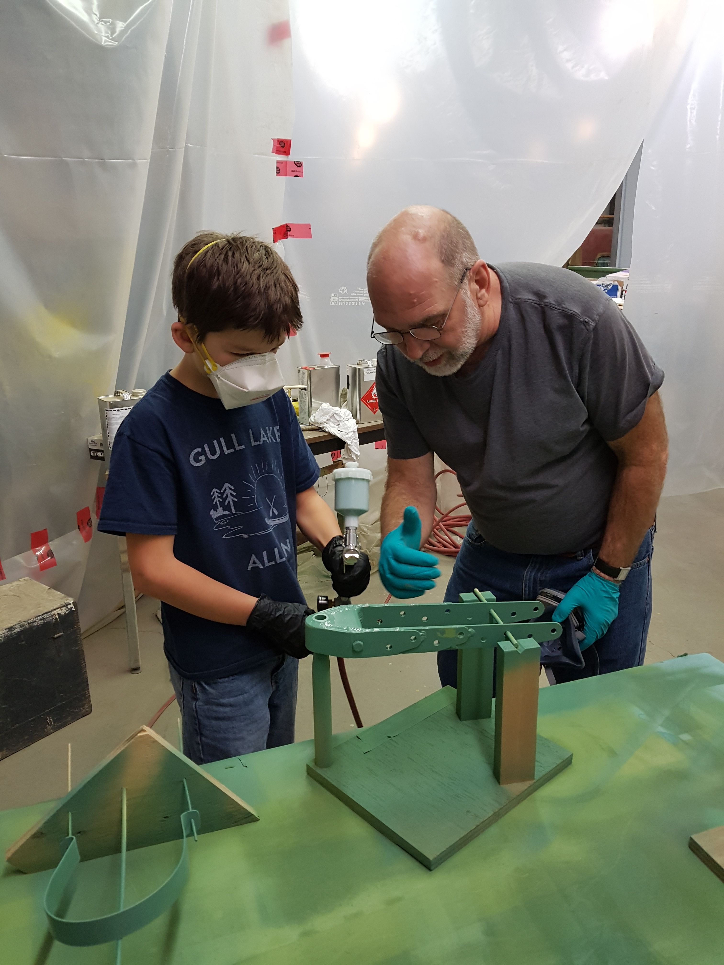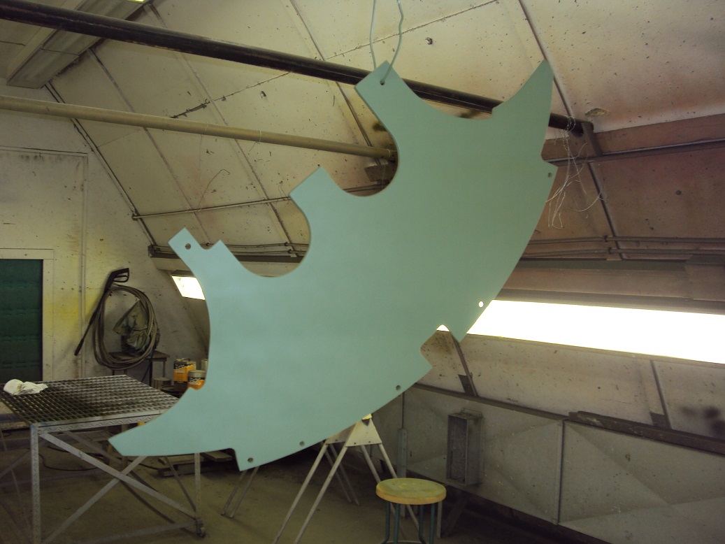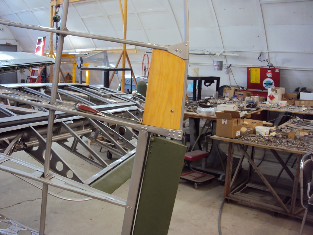Davey D. is now refitting the aft wing attach points after they have been cleaned and painted by Mathew S., who I will return to later in the report. Roger D. and Peter V. built a paint booth which is now in service and is giving us excellent results. With this we should be able to give a cleaner finish to painted surfaces with less heat loss from the building during the winter by not having to use the room sized paint booth for smaller parts. We now spend a large amount of time masking to ready the parts for paint of one color or another.